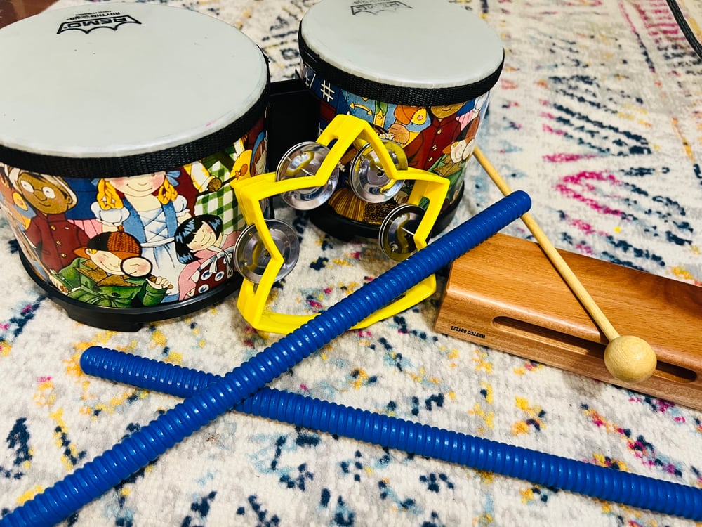 Once the kids are ready to play, have them transfer the Word Chain to a percussion instrument. Good examples are drums, rhythm sticks, wood blocks, and tambourines. I would not recommend something like a shaker because it can be a little tricky to hear the defined rhythm sounds.