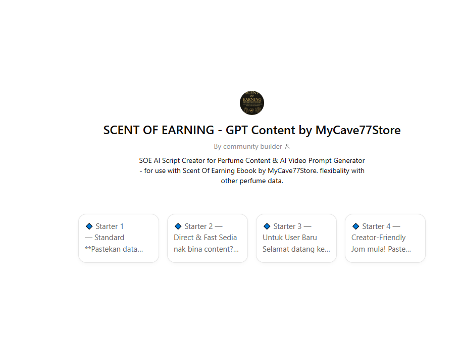 Scent of Earning™ ialah sebuah sistem lengkap yang menggabungkan EBOOK + CUSTOM GPT FRAMEWORK untuk menghasilkan skrip perfume yang mewah, emosional dan bersedia untuk TikTok, Reels atau Ads — hanya dengan copy & paste data produk.
