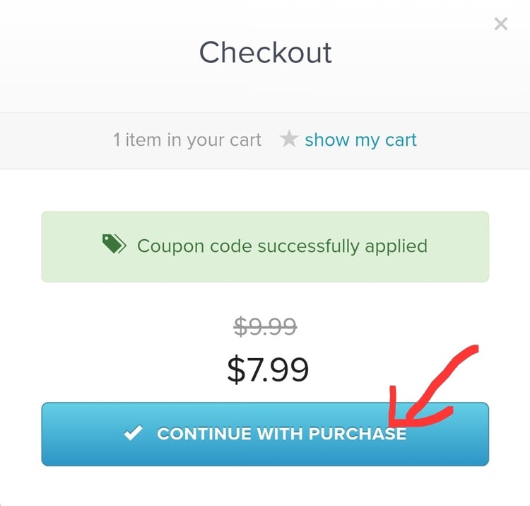 - 그러면 적용되었다는 메세지와 함께 바뀐 가격이 표시됩니다. 그리고 "Comntinue with Purchase" 클릭