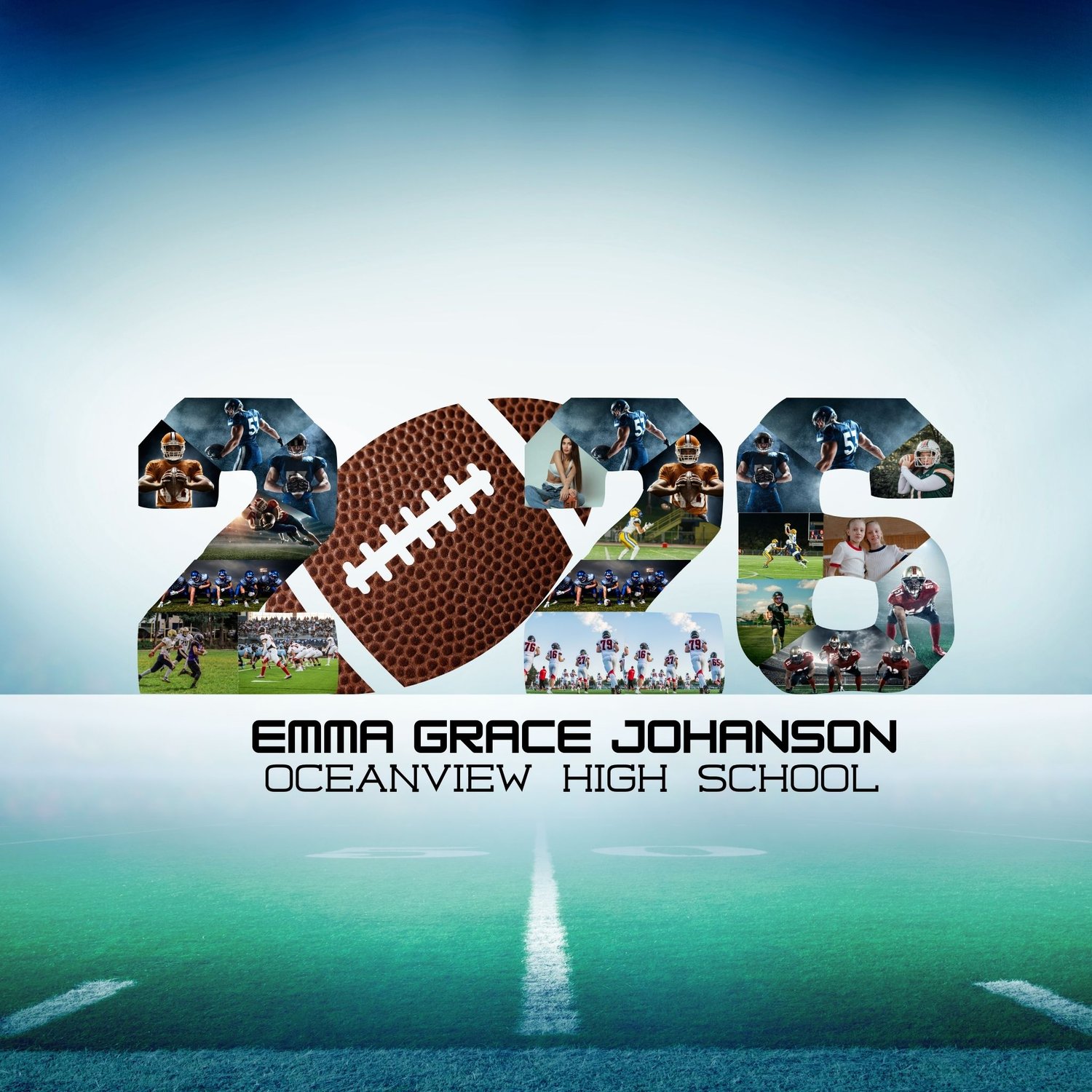 This design features the graduation year "2026" prominently, with each number acting as a photo placeholder, alongside a stylish "Senior" overlay. It's perfectly suited for high school and college graduates, especially those involved in sports, as demonstrated by the example showcasing football players within the numbers against a vibrant stadium background.