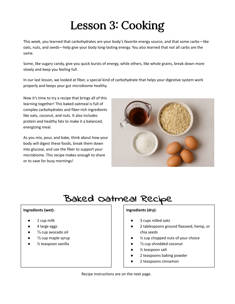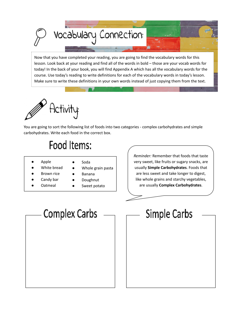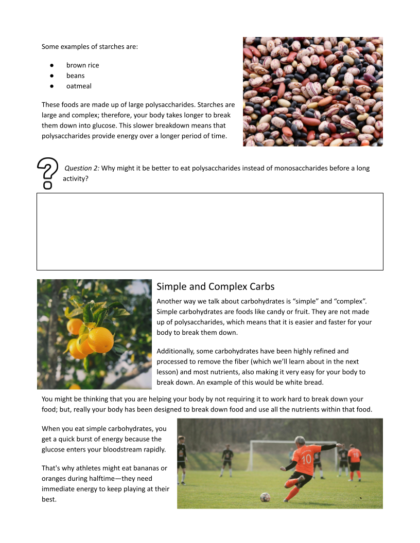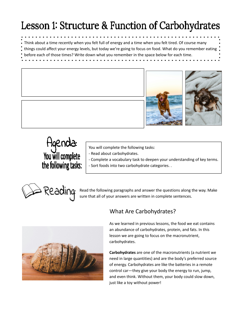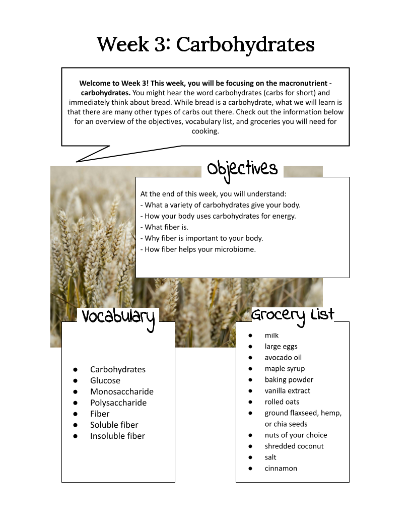 Each week begins with a brief overview of material. This page is from Week 3 which covers carbohydrates.