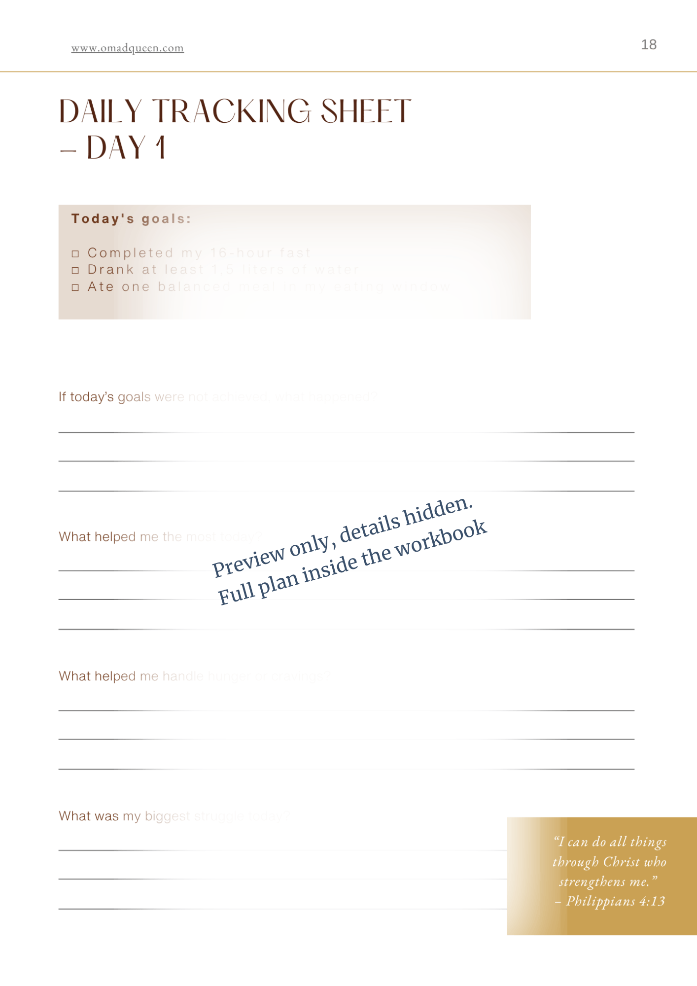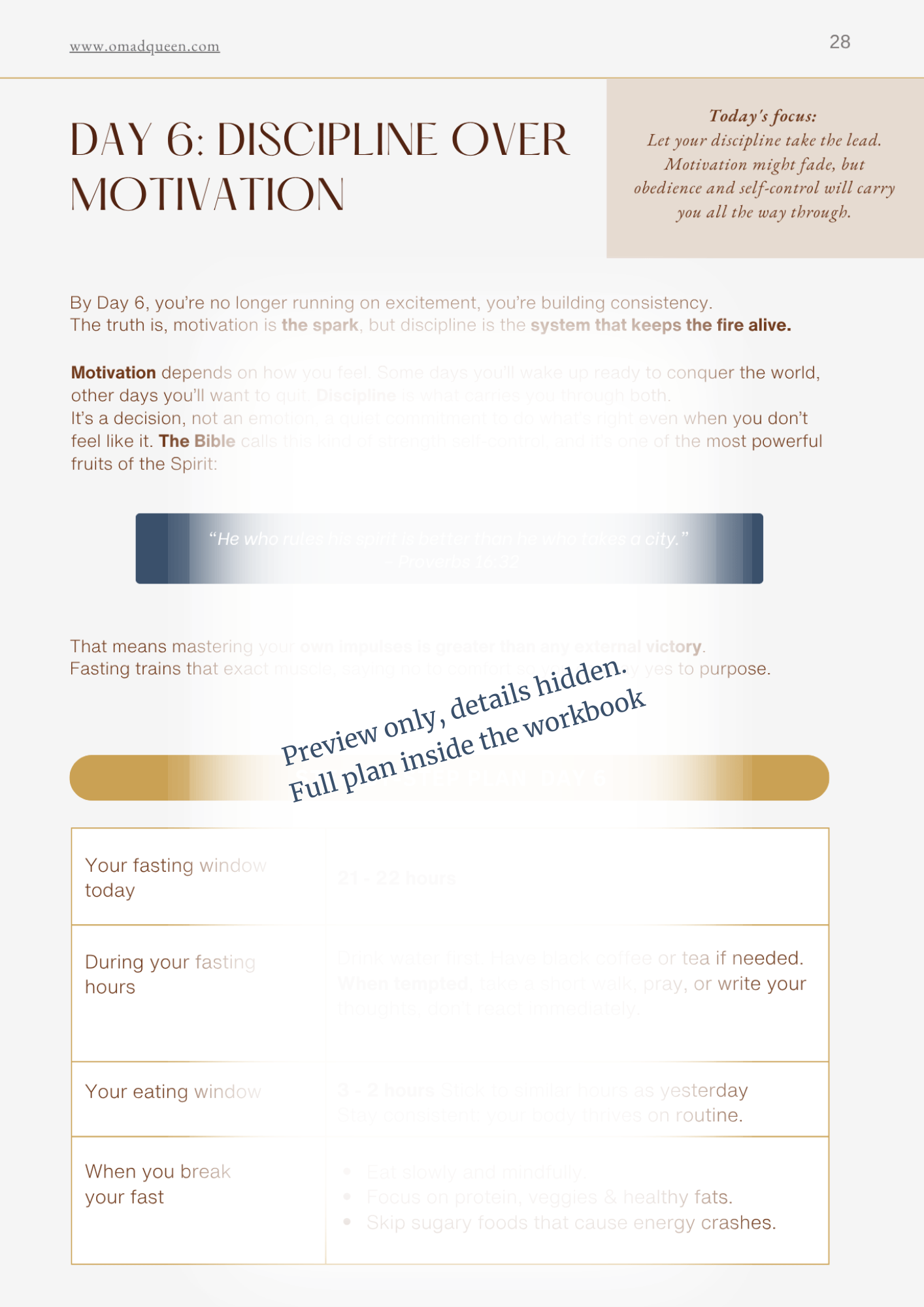 A 14-day plan: Step-by-Step workbook created especially for women ready to build discipline, balance, and confidence through the One Meal A Day lifestyle. Each day includes short lessons, fasting guidance, Bible verses and reflection exercises to help you gradually extend your fasting window, understand your body, and stay consistent with grace.