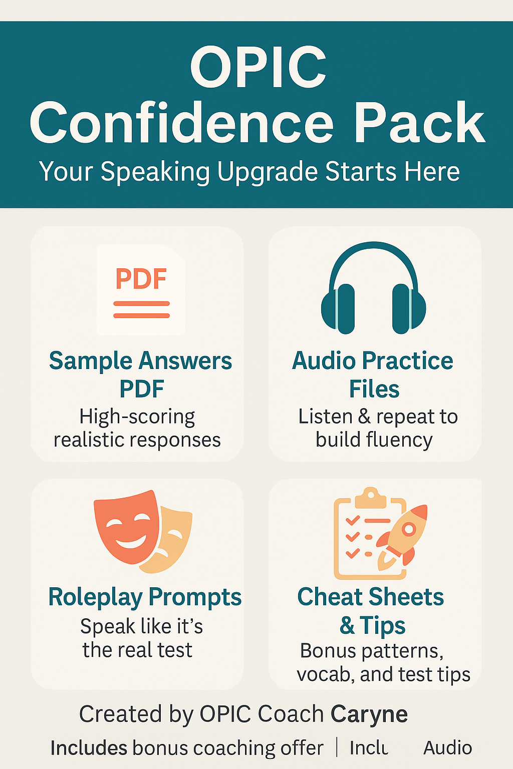 ๐ง The OPIC Confidence Pack โ Sample answers, roleplay prompts, tips, and AI audio to boost your speaking score.