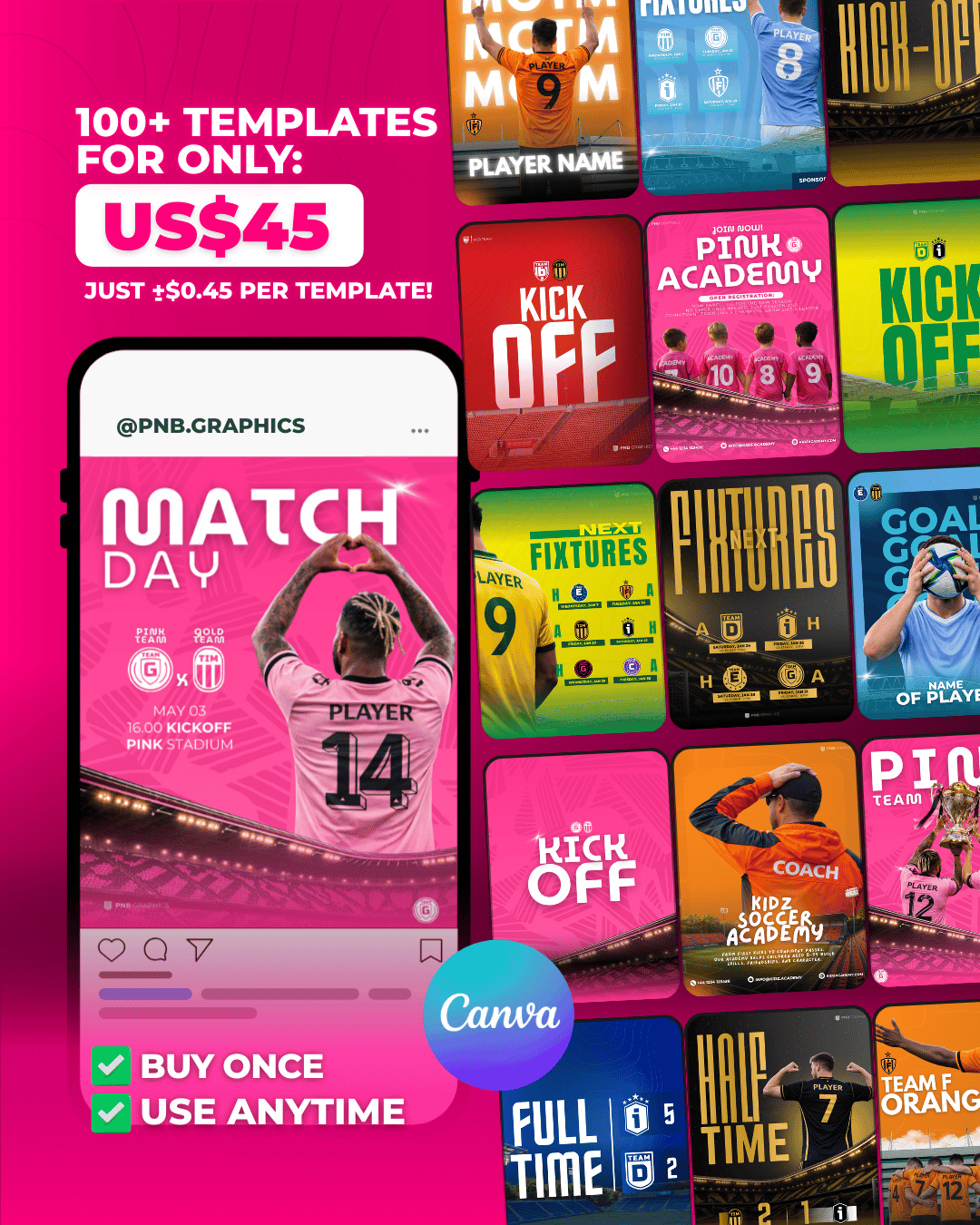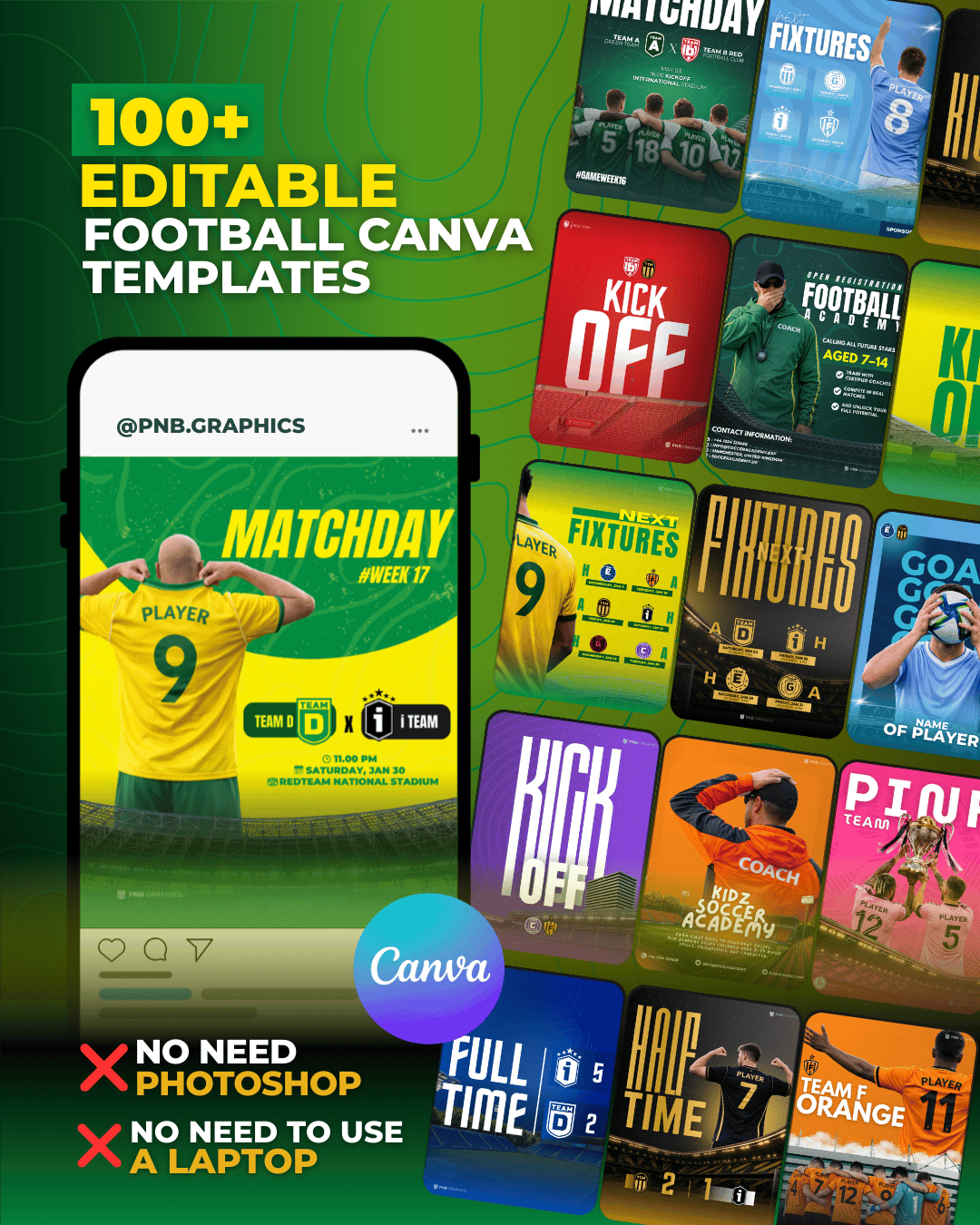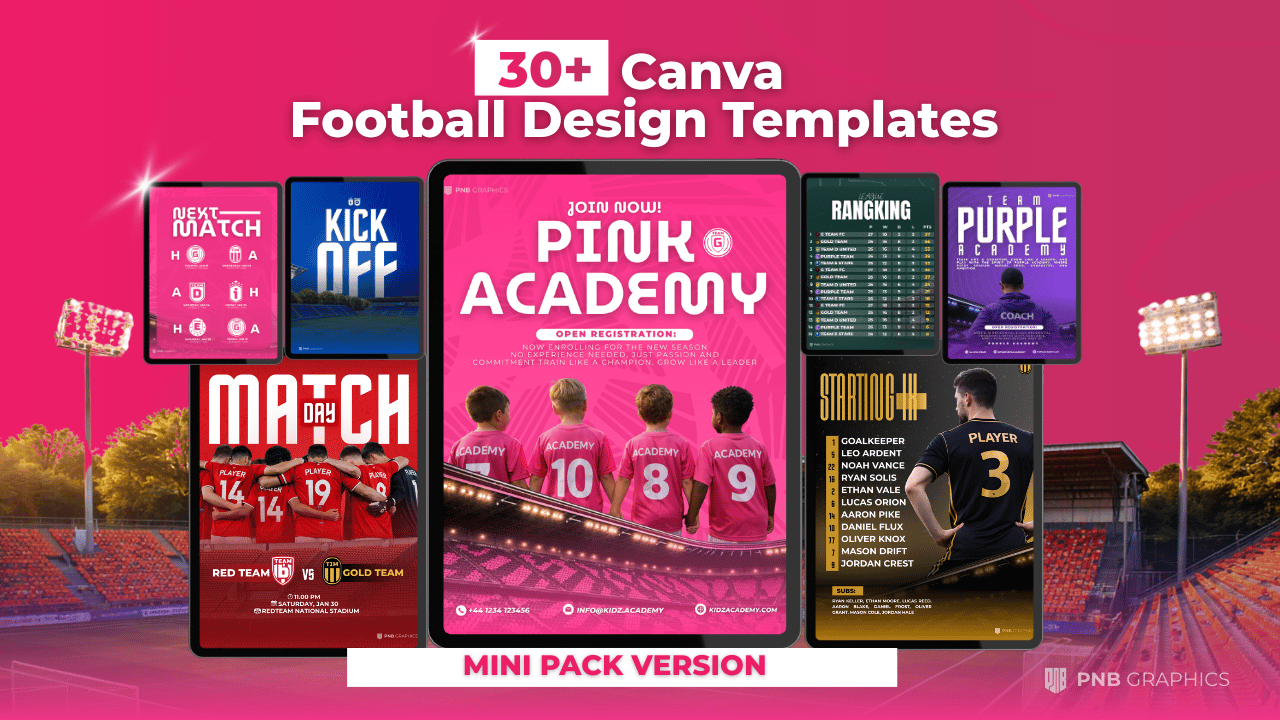 Take your football visuals to the next level with this exclusive bundle of 100+ editable Canva templates by PNB Graphics.