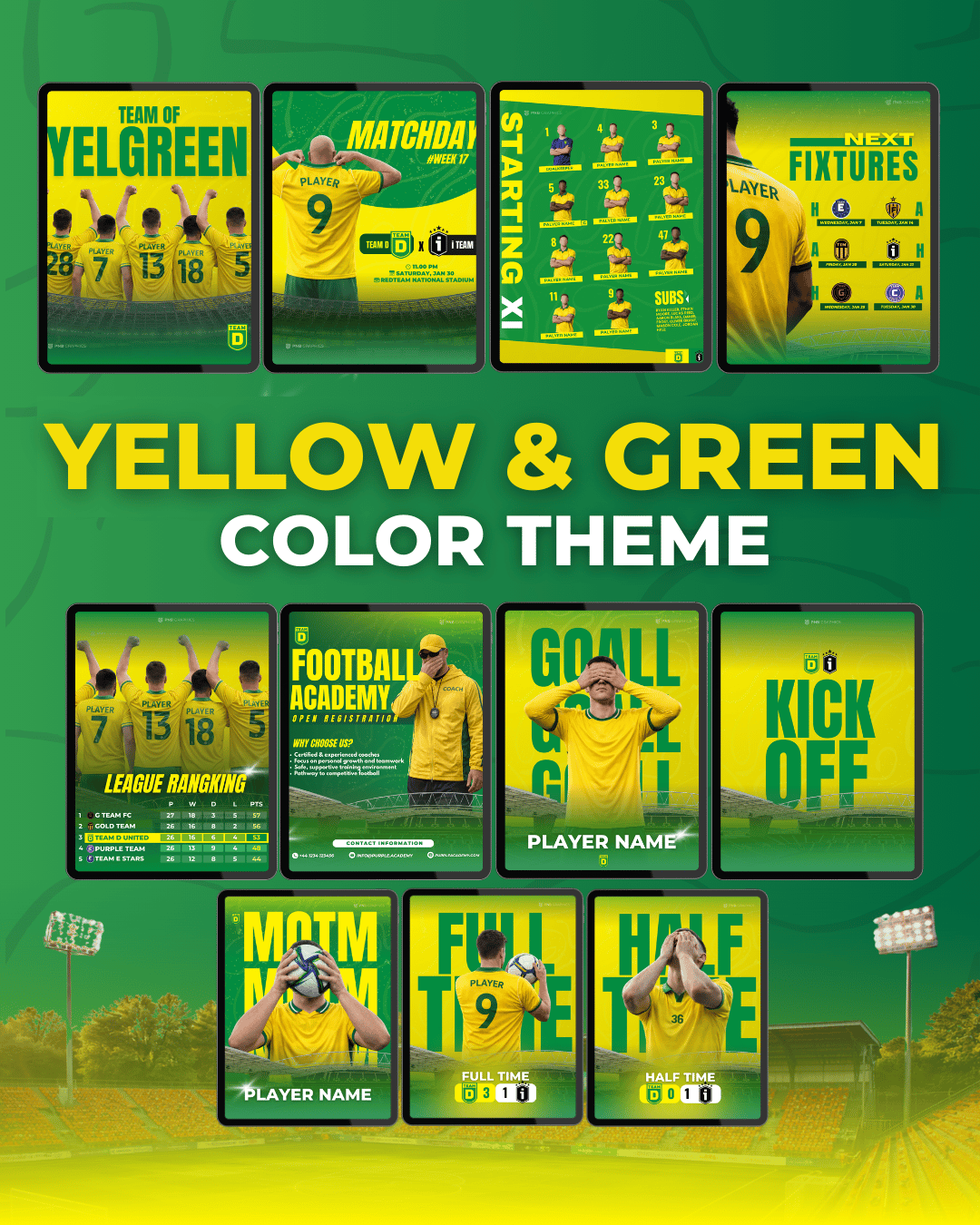 Perfect for football teams, academies, matchday posts, and social media campaigns — all designed to be simple, stylish, and fully customizable.