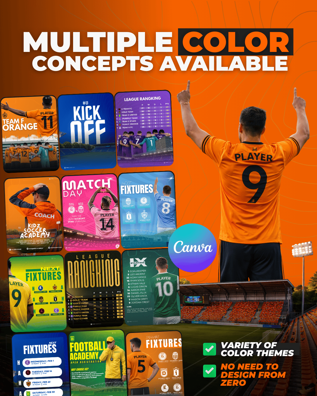 ✅ Versatile Design Categories: Matchday Posters, Starting Line-Ups, Final Scores, League Tables, and much more.