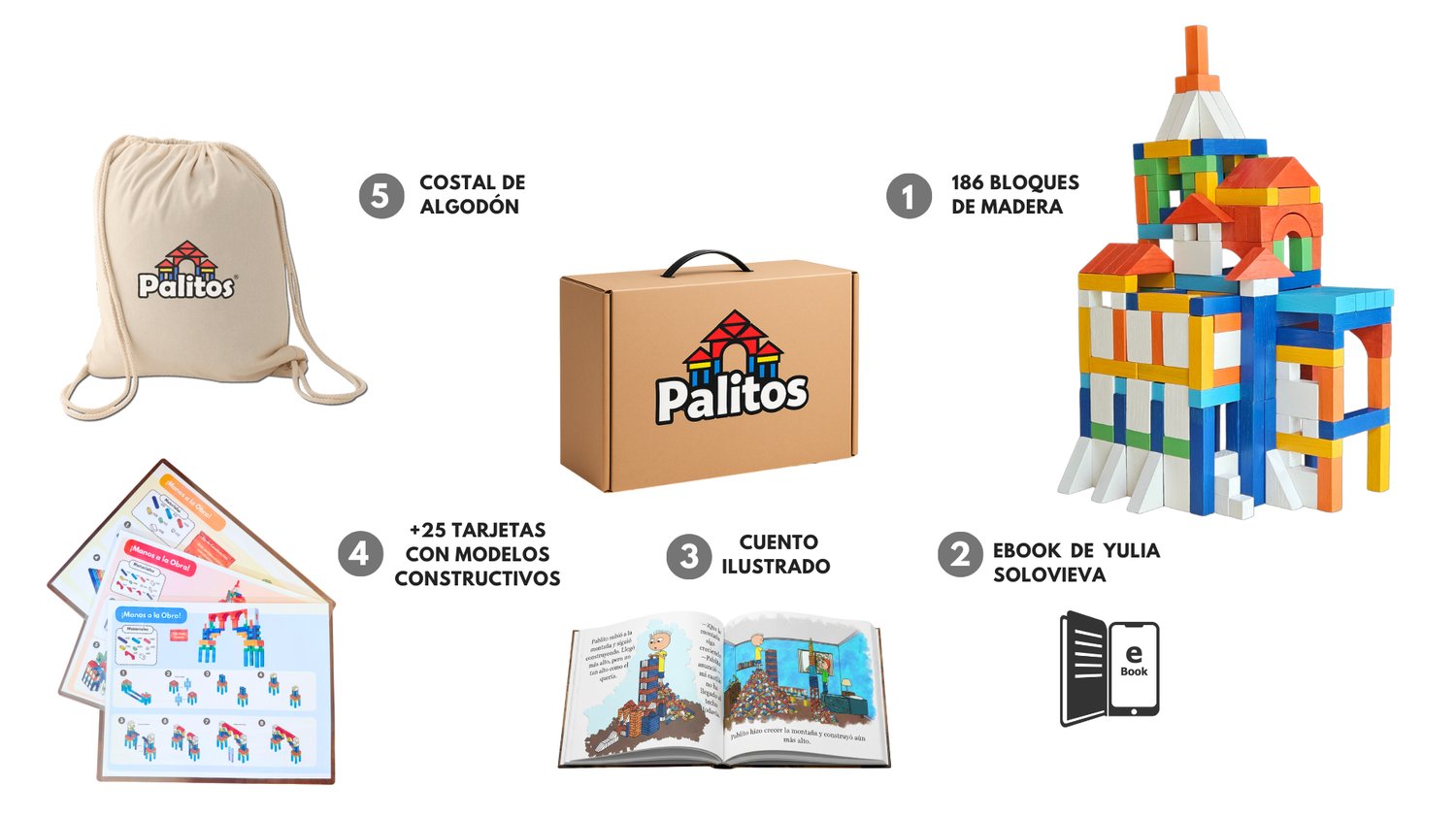 A partir de bloques de madera de distintas formas y tamaños, el sistema Palitos invita a construir modelos progresivamente más complejos con la guía del adulto, siguiendo un enfoque psicológico basado en la teoría histórico-cultural y la zona de desarrollo próximo.