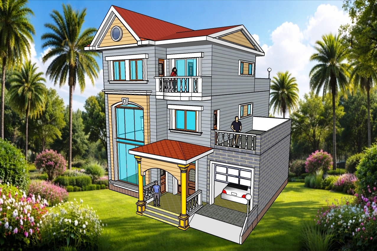 V-534| Three Story House Plans, Triplex Villa 5 BR. 4.5 Bath. 4 Family, 1 Car Garage, Drawings in Feet & Meter.