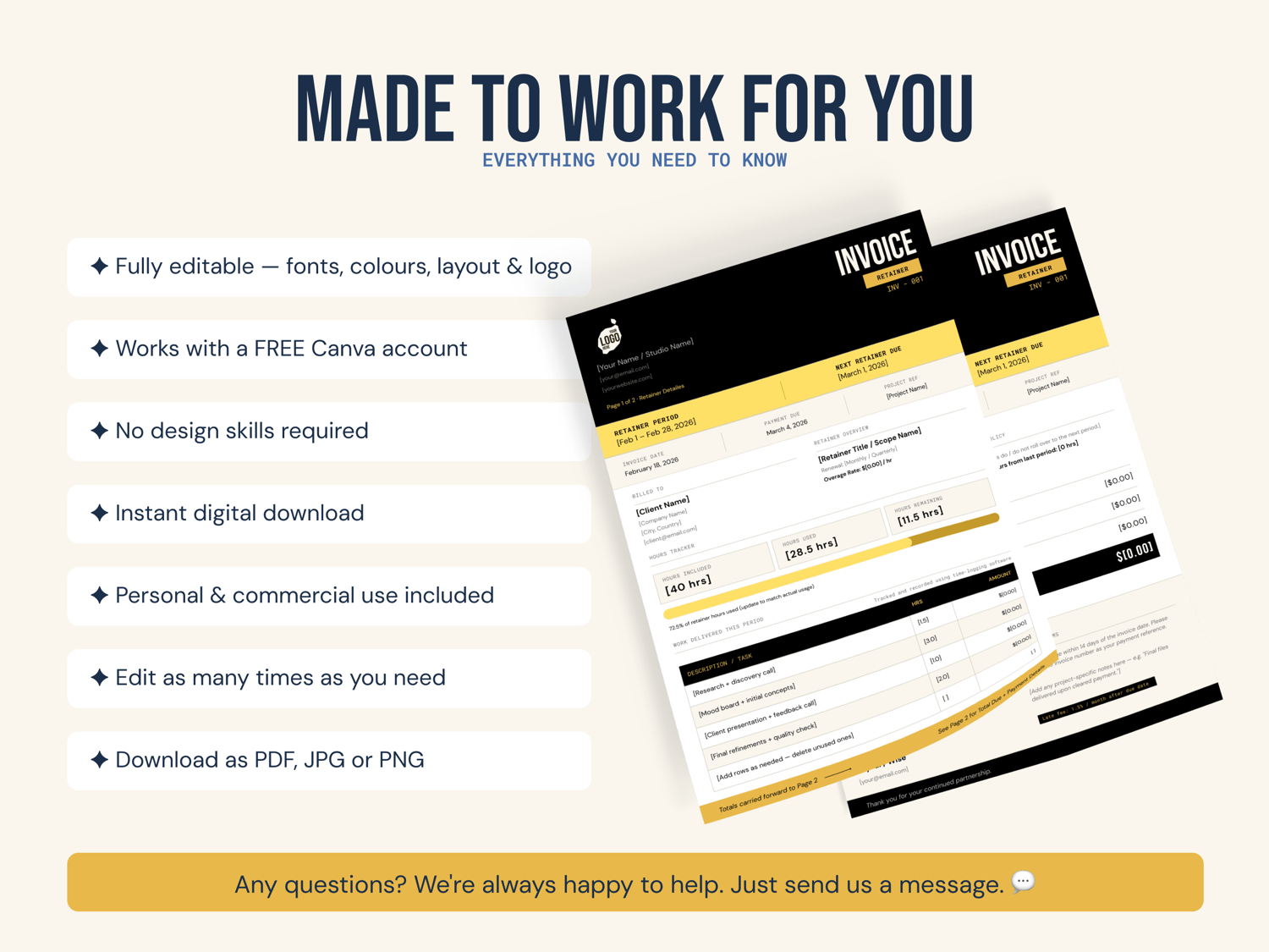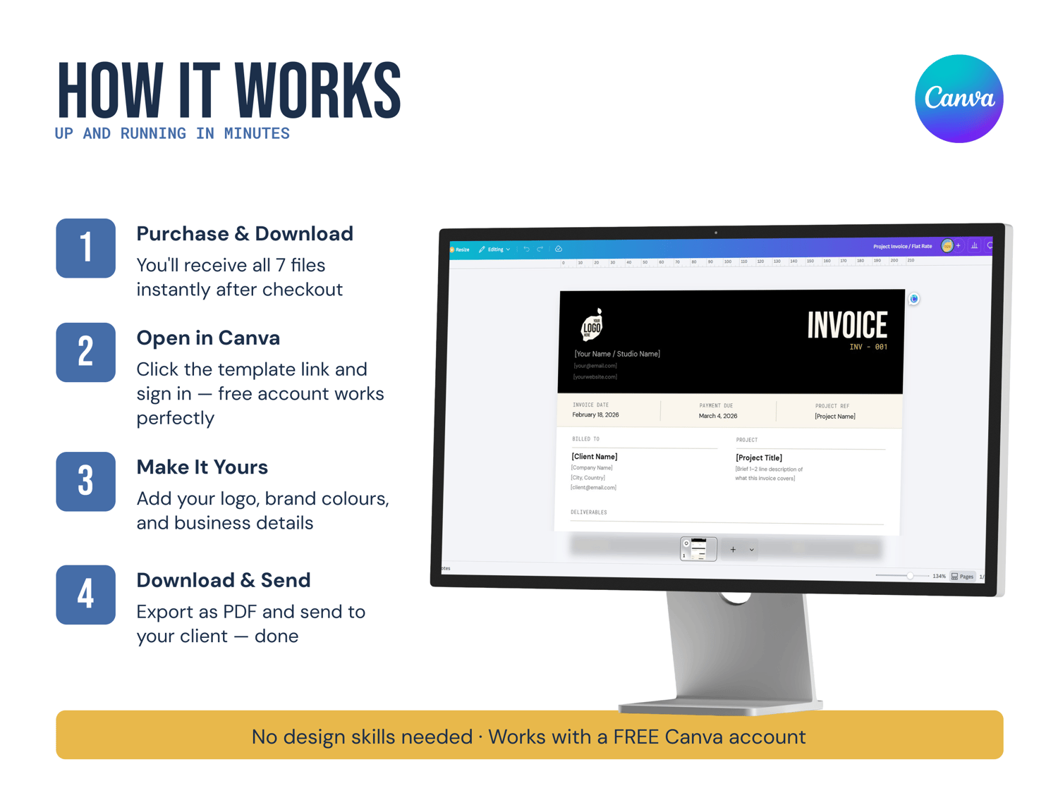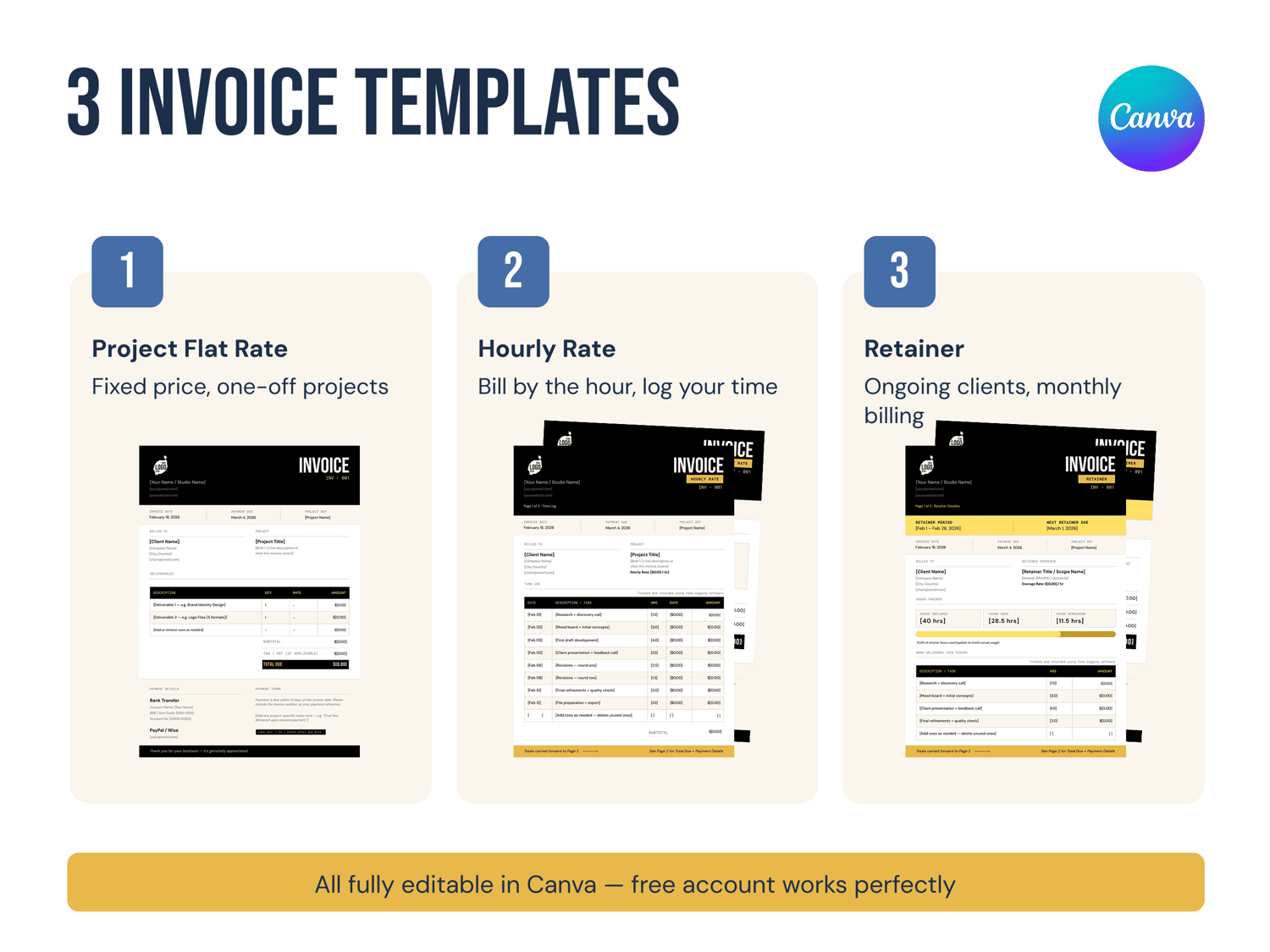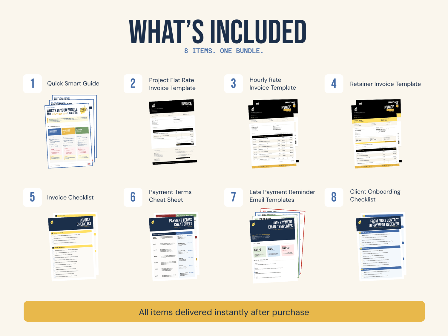 Everything you need is right here: 3 editable Canva invoice templates, 4 ready-to-use PDF business tools and a Quick Smart Guide to get you started immediately.