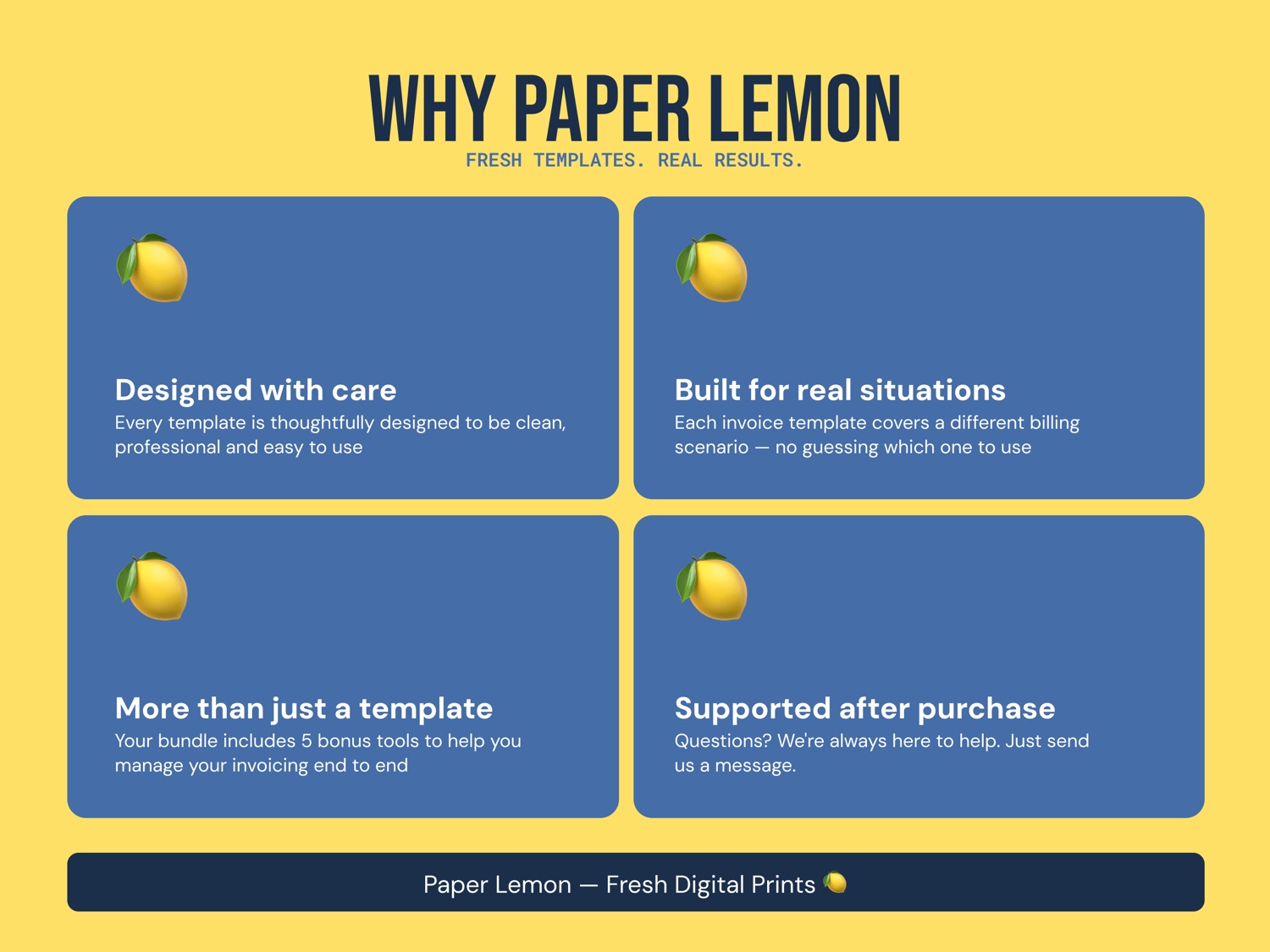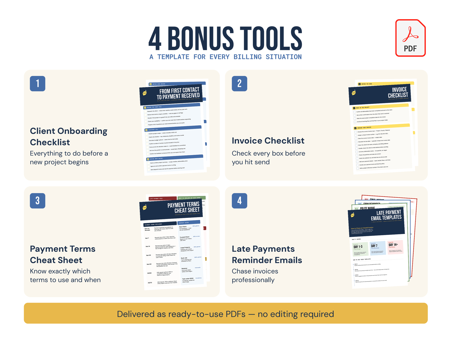 Every template is designed for a specific billing situation because one invoice does not fit all. The bonus tools mean you have a full invoicing system ready to go. Not just something that looks good.