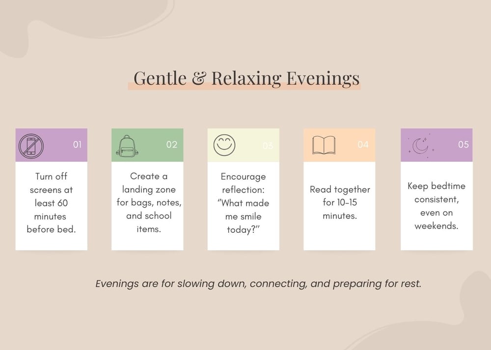 Evenings are for slowing down. A predictable pattern helps children switch from busy energy to rest.