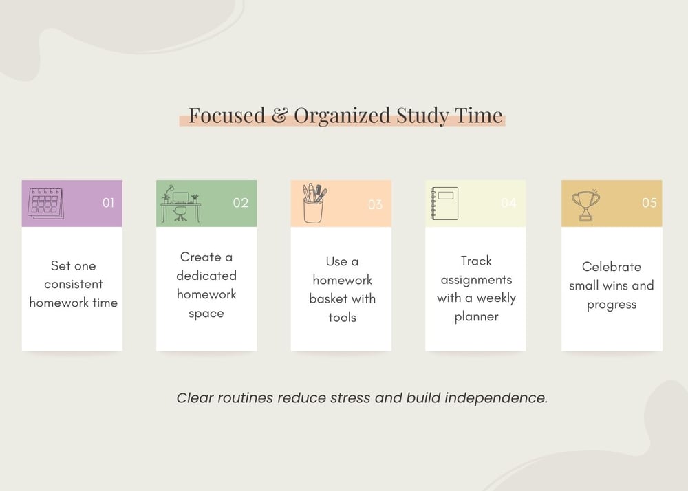 - Use a “homework basket” with pens, pencils, paper, and tools.