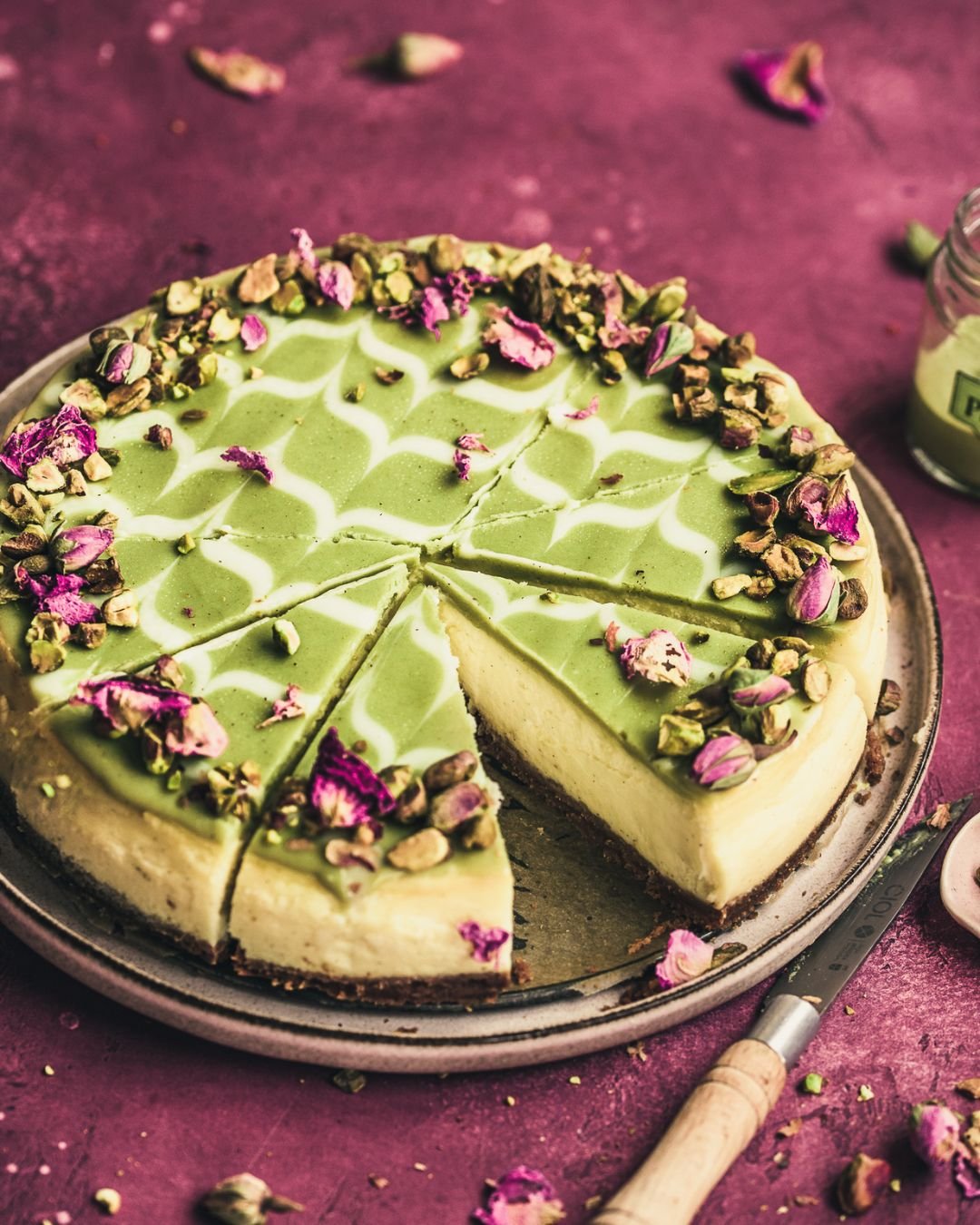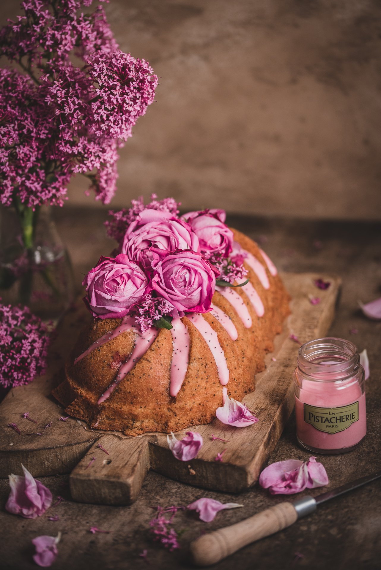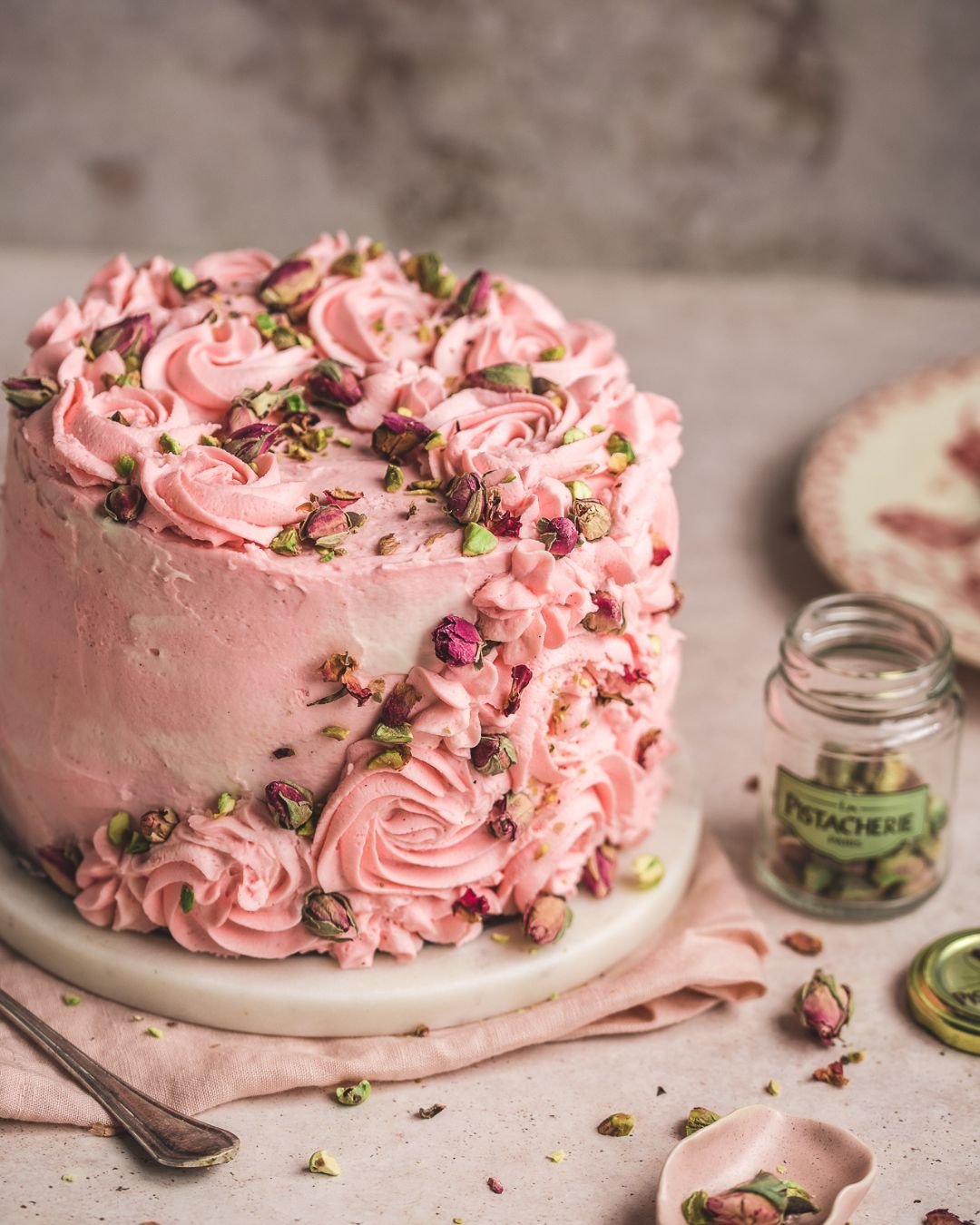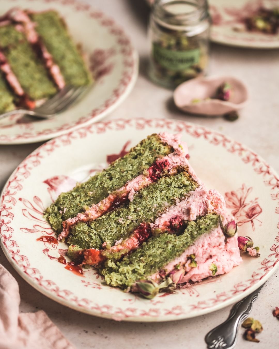 ★ Bolo de pistáchio e frutos vermelhos com mascarpone de chocolate branco e rosa