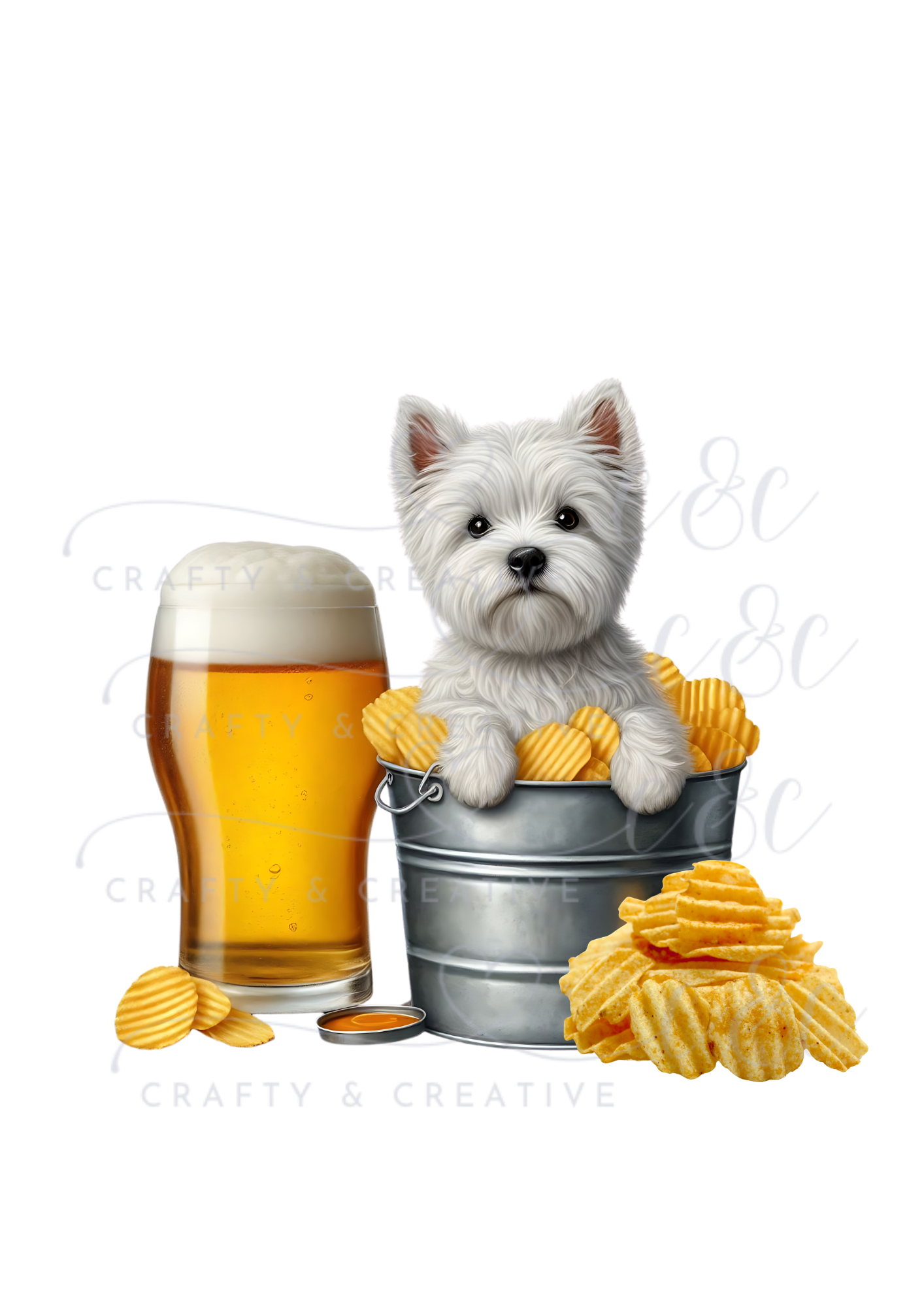 Cute White Westie Terrier, West White Highland Terrier, Soaking in a Pint of Beer having a Pub Lunch