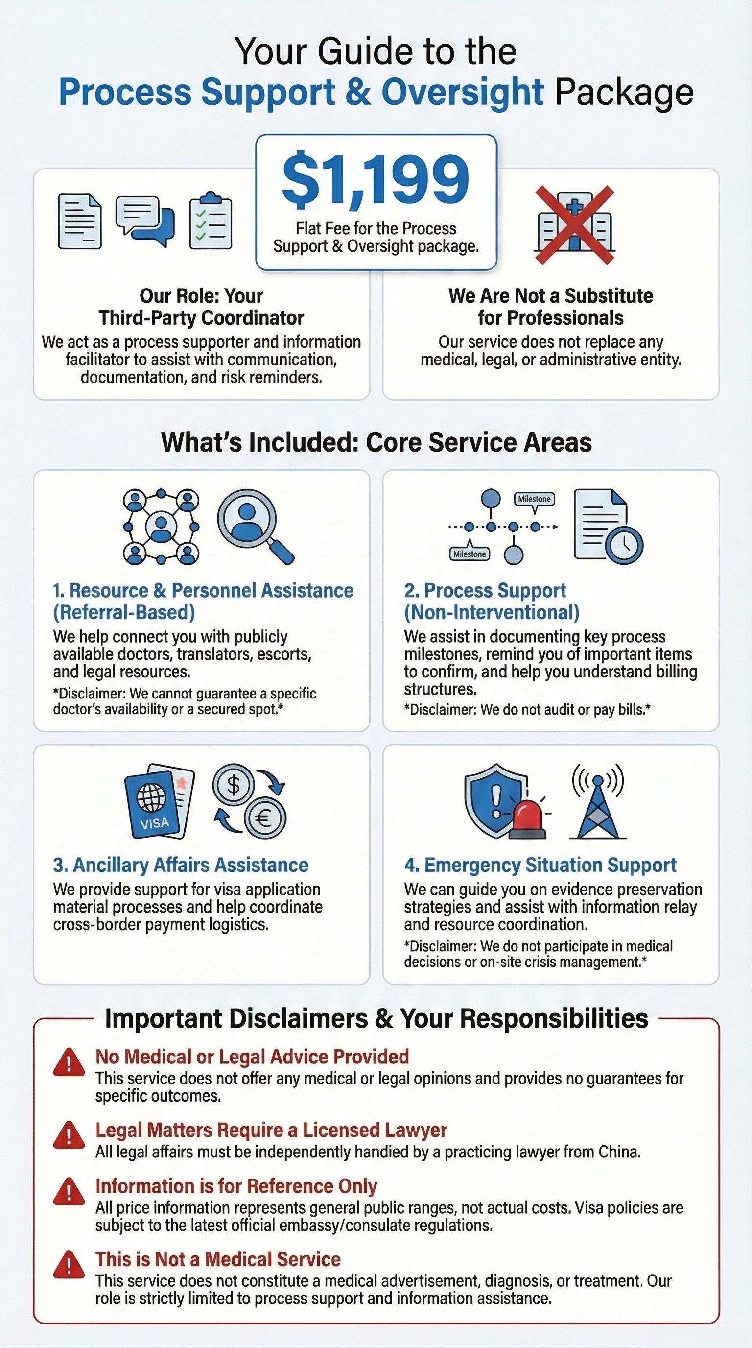 Coordination of publicly available resources and assistance with procedures such as visa preparation, payments, and documentation.