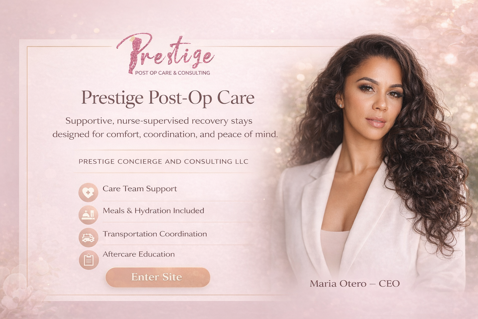 Welcome to Prestige Consulting, where expert care meets compassionate service. I'm Maria Otero, a dedicated professional with over 14 years in the medical field and 12 years specializing in post-operative care, wellness coaching, and body sculpting. My passion lies in helping women heal, recover, and regain confidence after surgical procedures.