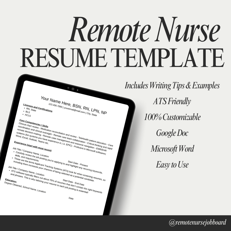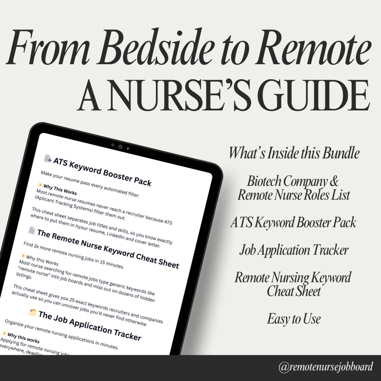 As a nurse, I know firsthand how frustrating it is to feel stuck at the bedside while remote roles feel out of reach. After years of navigating the process myself, I created this bundle to make it easier for other nurses to transition. Each tool is designed to translate your bedside experience into remote-friendly language, uncover hidden job opportunities, and help you apply smarter so you can get hired faster.