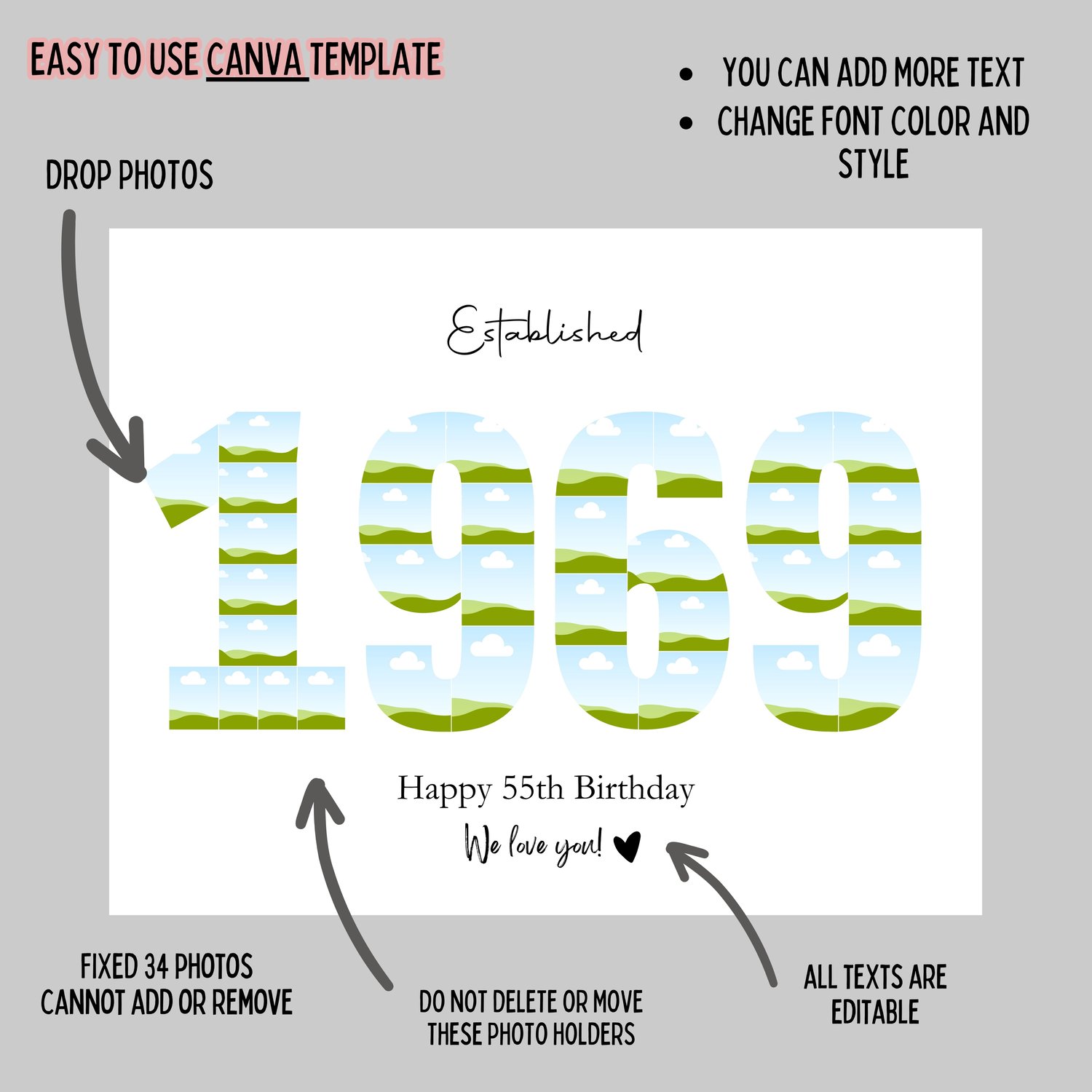 EDITABLE Custom 1969 Collage, 55th birthday collage print, Photo Collage Template, Number Collage, Digital Template 55 years