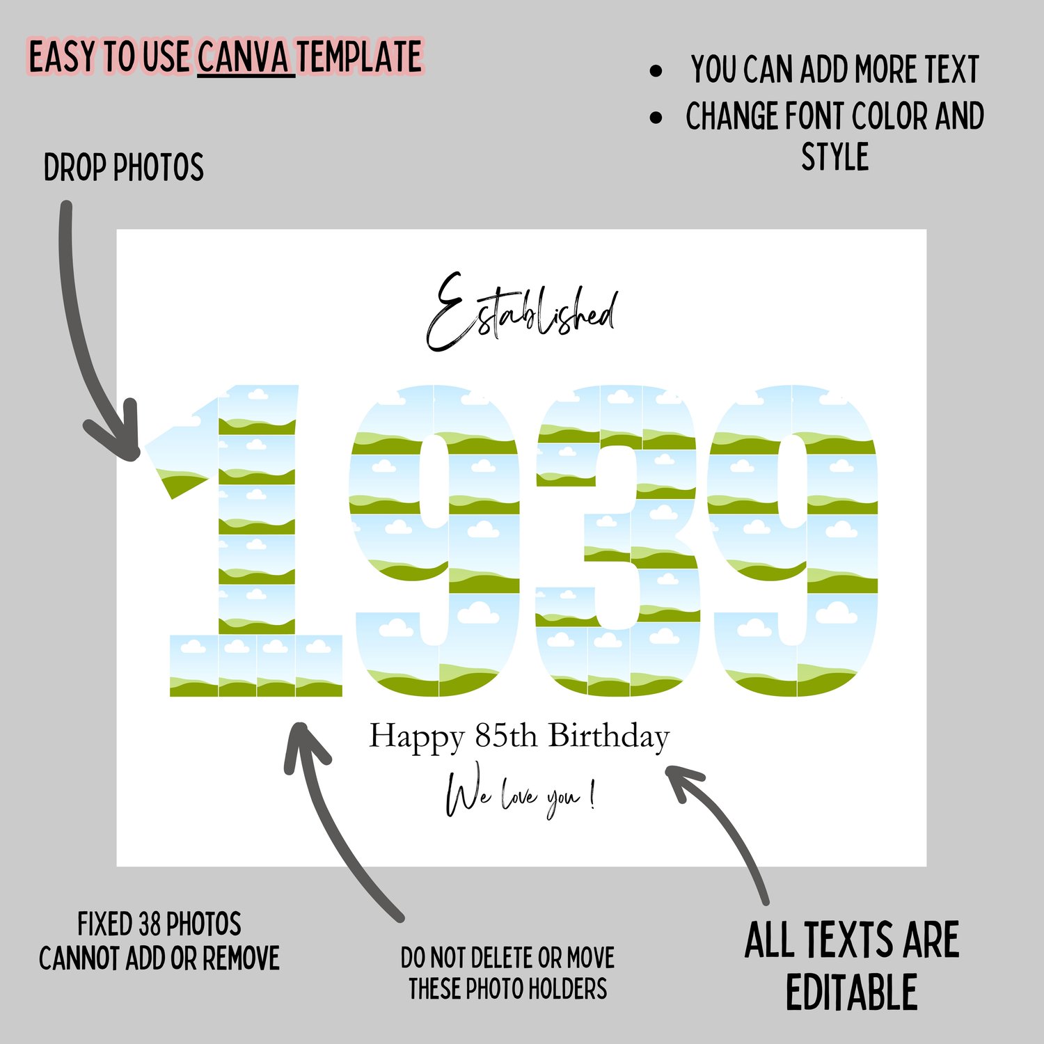 EDITABLE Custom 85 Collage, Year 1939, 85th birthday anniversary Photo collage print, Gift for grandma grandpa