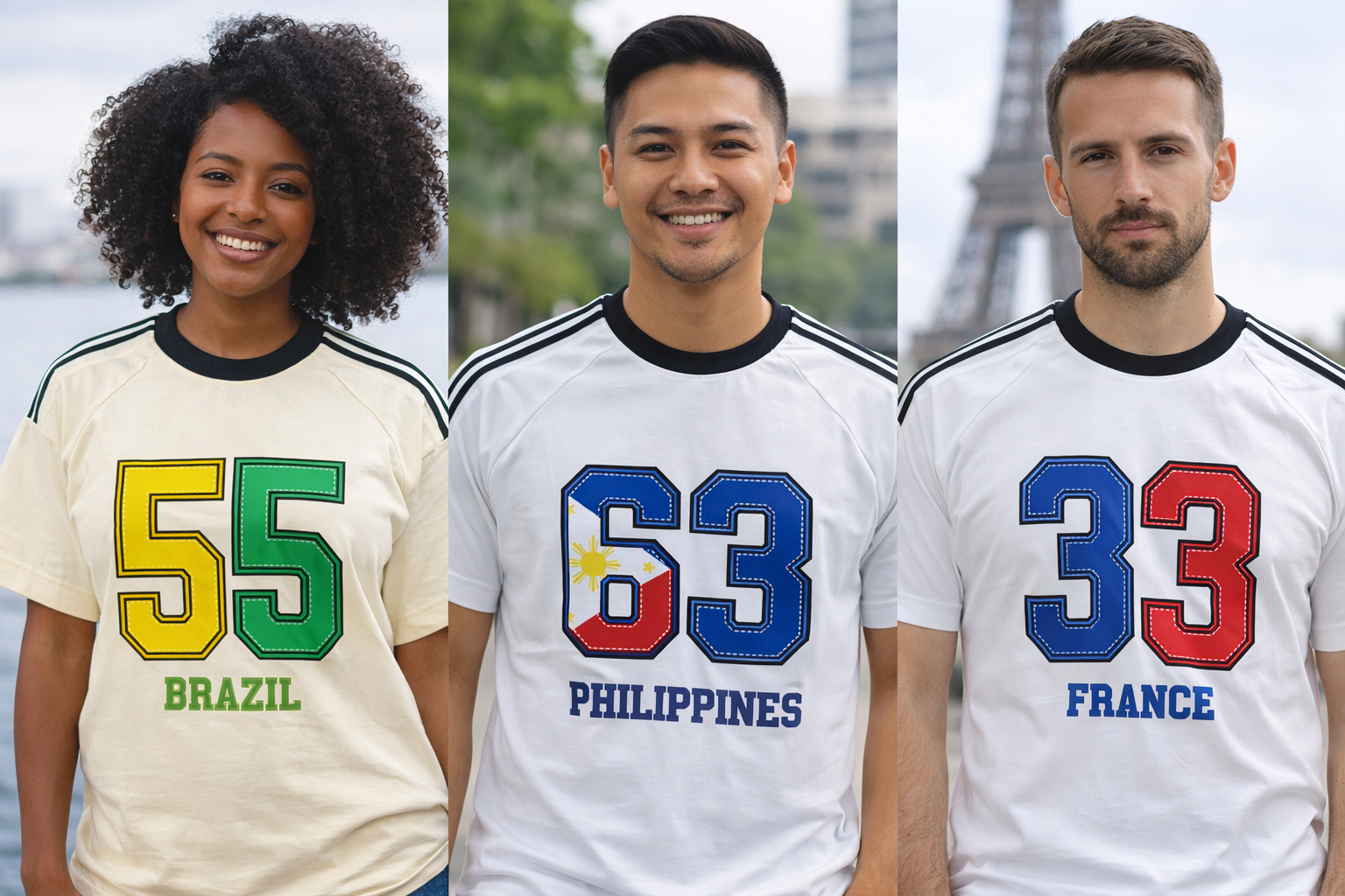 These jerseys feature bold numbers and nation names, including designs for Brazil , the Philippines , and France . It's the perfect way to represent your heritage with a clean, athletic look.