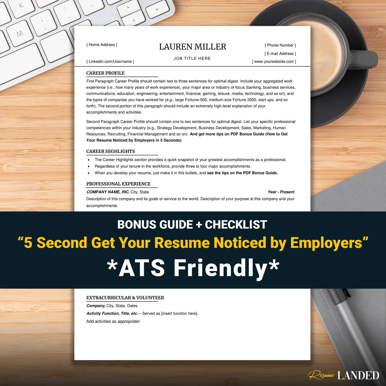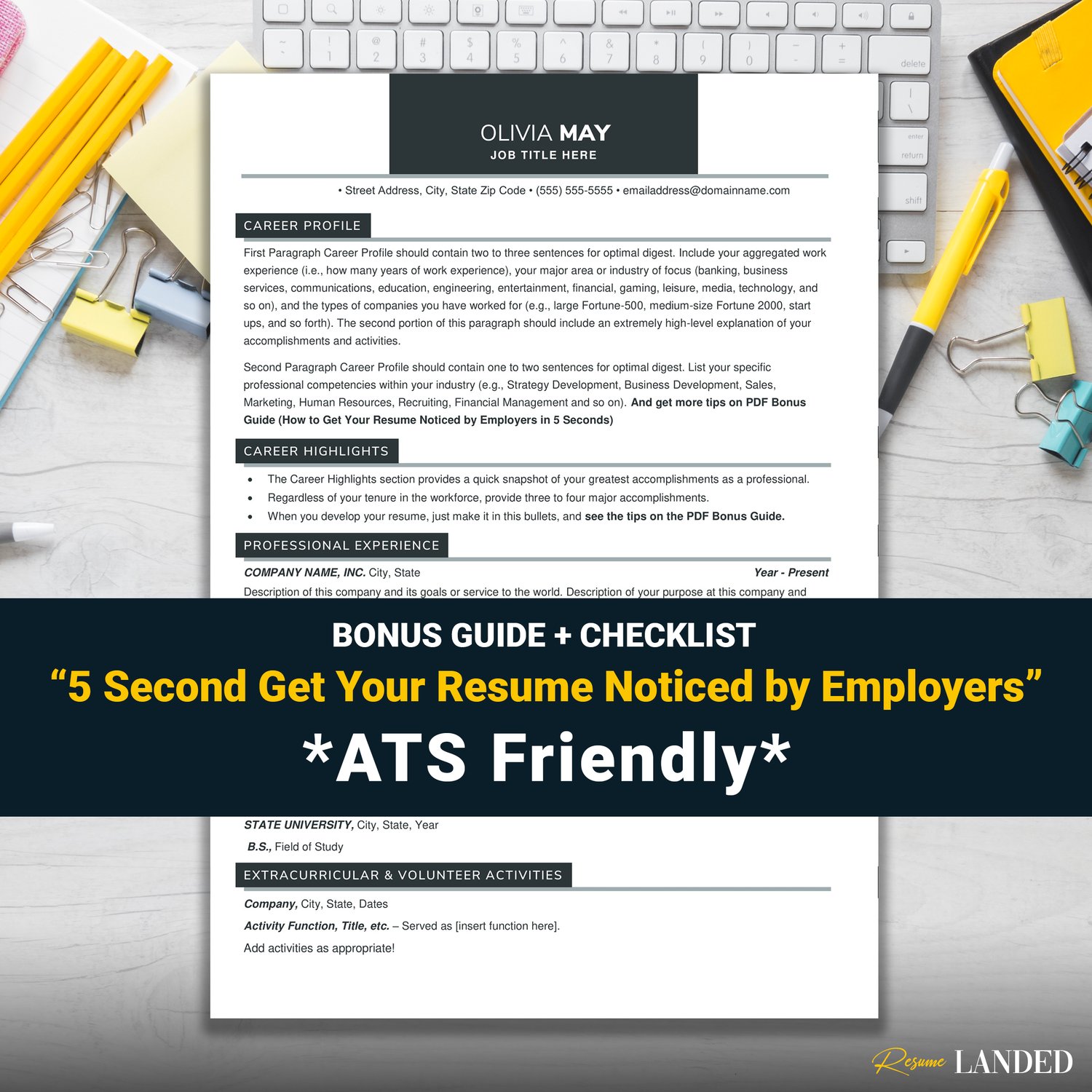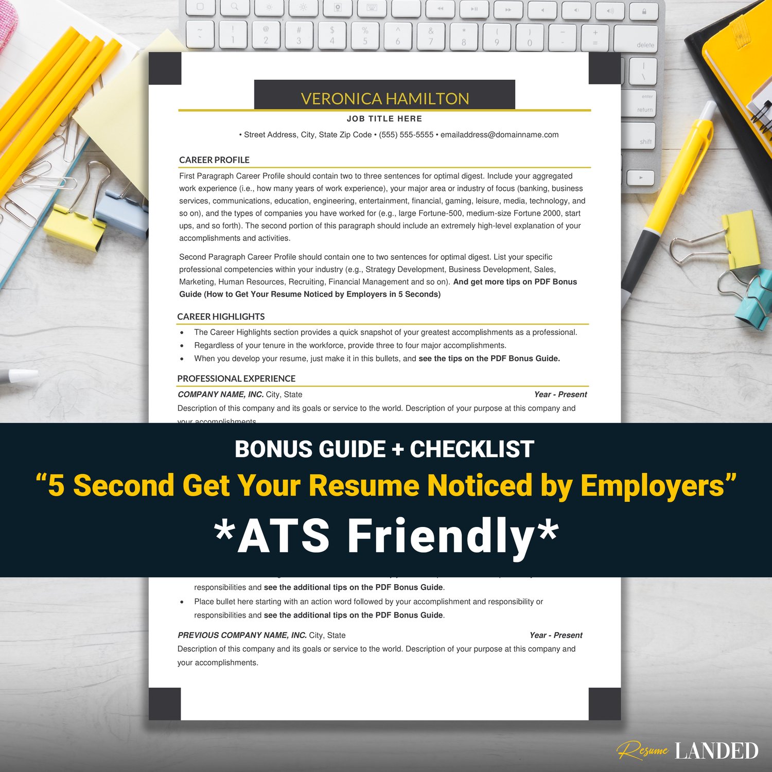 Your purchase also includes a free resume writing guide "How to get your resumenoticed by employers in 5 seconds", so you can stop Googling old, outdated answers and start applying ASAP (knowing that your resume stands out from the rest)!