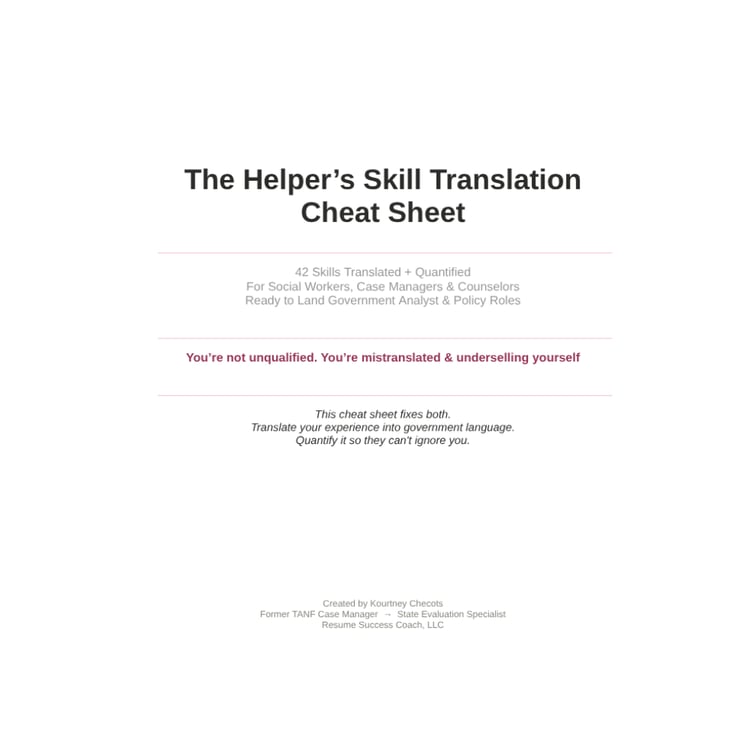 Hi, I'm Kourtney! Former TANF case manager turned State Evaluation Specialist, and the founder of Resume Success Coach. After 8.5 years in direct care, I made the pivot into government analytics myself. Now I help social workers, case managers, and counselors do the same.