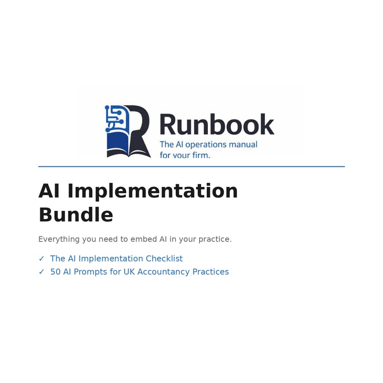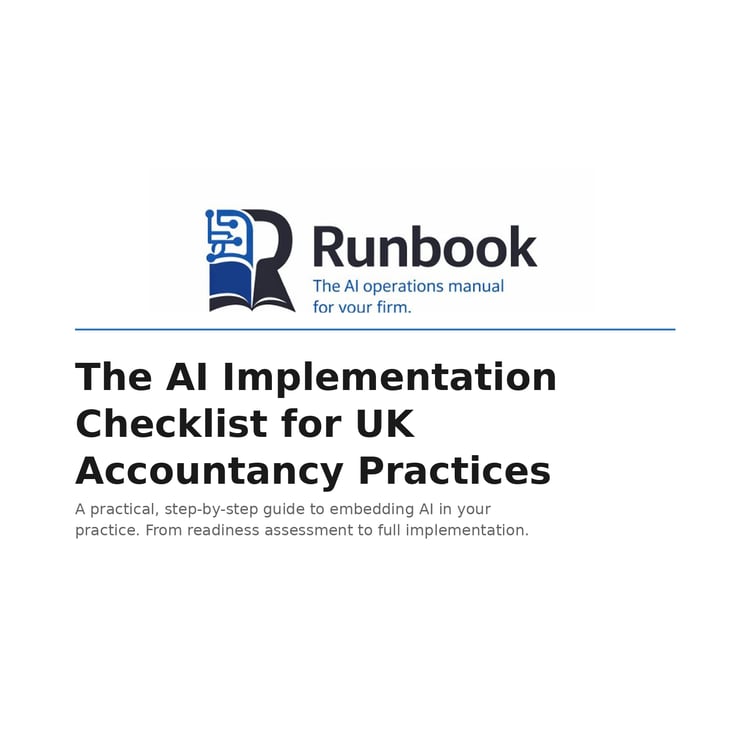 Runbook builds practical AI implementation resources for UK professional services firms. Our playbooks, templates, and prompt libraries help accountancy practices with 5-50 staff put AI to work without the jargon, without the hype, and without needing an IT department. Built specifically for the UK market, with real tool recommendations, data protection considerations, and implementation timelines designed for firms where everyone already has a day job.