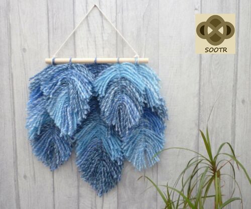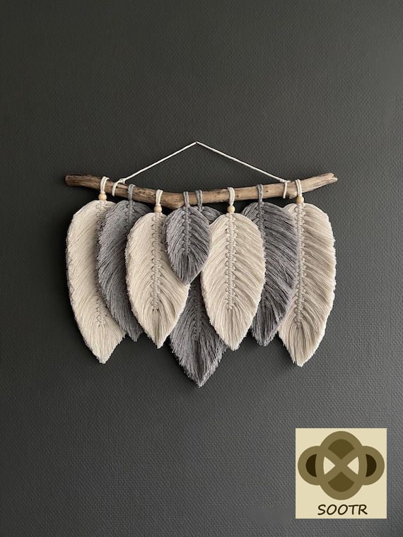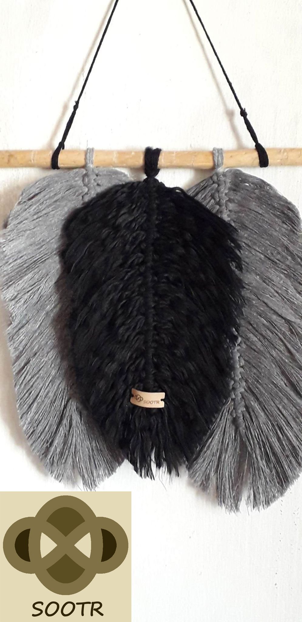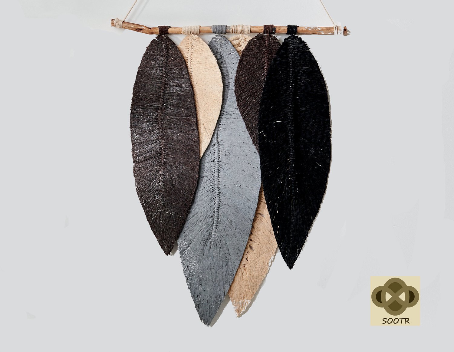 BLACK, GRAY & BEIGE LONG FEATHERS HANG WALL WITH NATURAL BRANCH