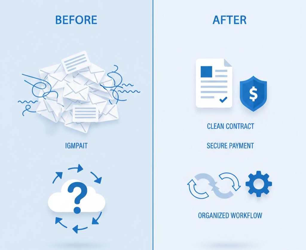 It’s a complete workflow used by real freelancers and small studios to keep control of their projects — legally safe and client-friendly.