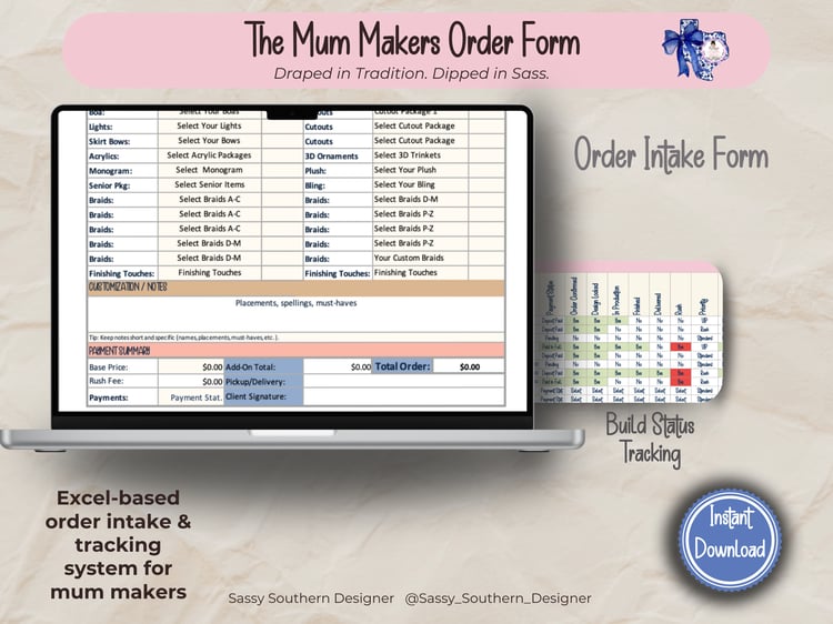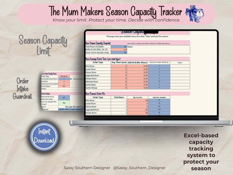 Hi, I'm the maker behind Sassy Southern Designer, where tradition meets smart systems. After years of building homecoming mums, I created tools to solve the biggest struggles I saw over and over again: guessing prices, overbooking seasons, and pushing past healthy limits.That's why I built The Mum Makers Pricing Playbook, Order Form, and Season Capacity Tracker. These tools are designed to help mum makers price confidently, manage orders clearly, and protect their time without burnout.