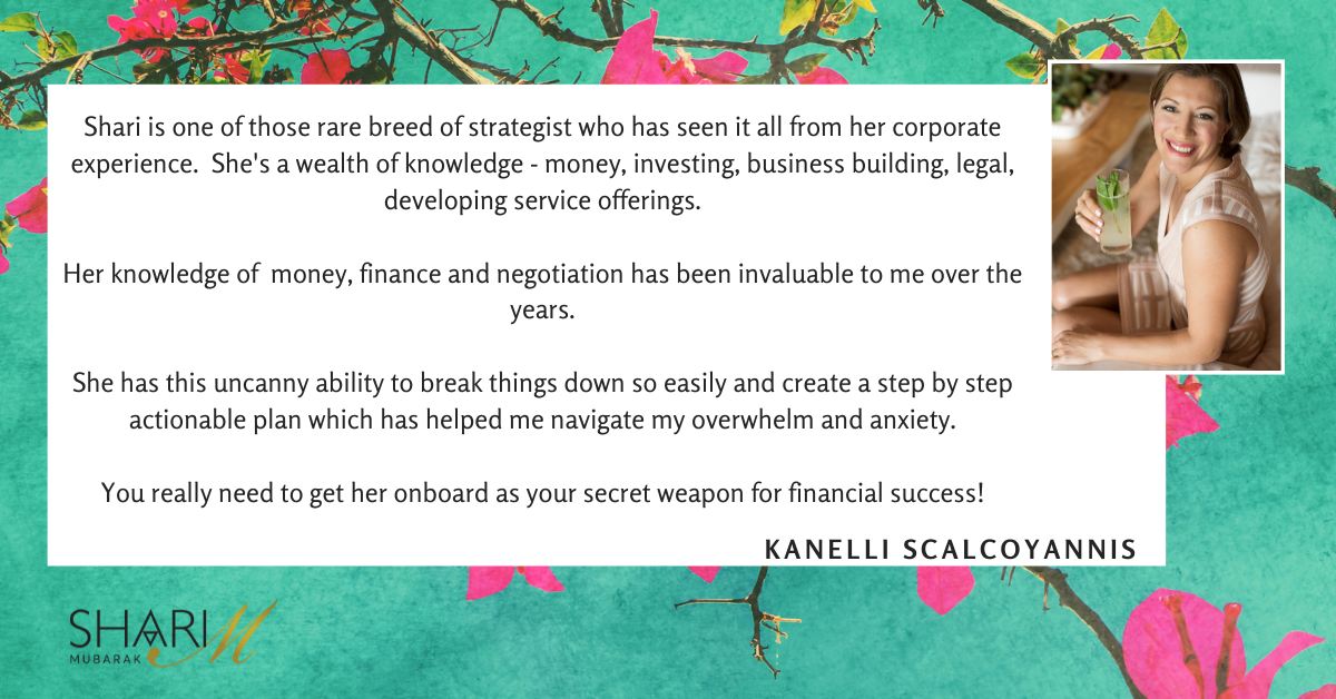 Shari is one of those rare breed of strategists who has seen it all from her corporate experience. She's a wealth of knowledge - money, investing, business building, etc.