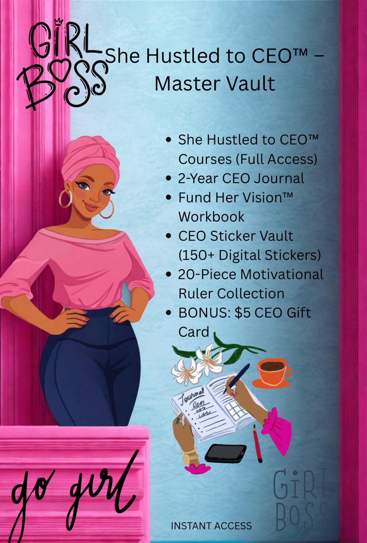 Start with the Confidence & Clarity Bundle, then upgrade to the She Hustled to CEO™ Master Vault for the complete CEO experience.