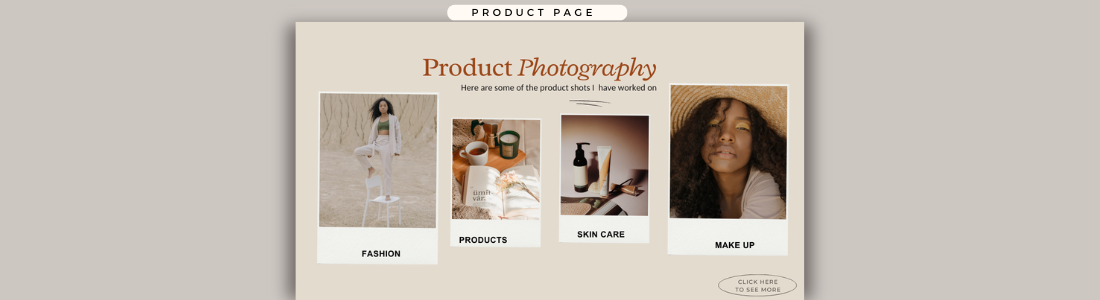 The Product Page is where you can highlight your skills in capturing product-focused content, a crucial aspect of UGC creation. On this page, it's important to display two key types of product photography: