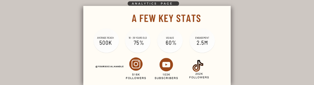 On this page you are offering potential clients insight into your social media performance and the impact of your content. Brands love seeing measurable results because it helps them gauge how your content might perform for their own campaigns. Here’s what to include on this page: