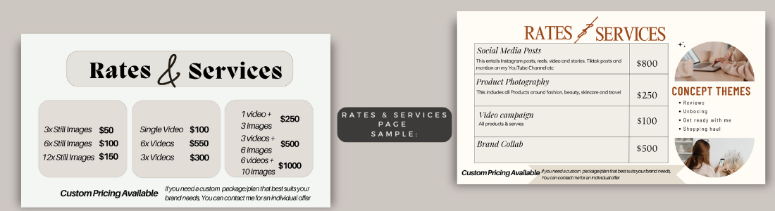 Your Rates and Services page is essential for giving brands a clear understanding of what you offer and how much it will cost them to work with you. This page should outline the types of content creation services you provide, your rates, and offer flexibility depending on the size and nature of the client. Here’s how to effectively set up this page: