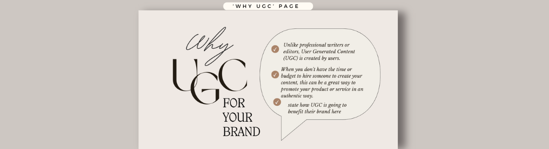The "Why UGC" page is your opportunity to explain to brands why User-Generated Content is an essential marketing tool and, more importantly, why you are the right UGC creator for them. This page should help potential clients understand the value of UGC, what they can expect when working with you, and how your approach will elevate their brand's presence.