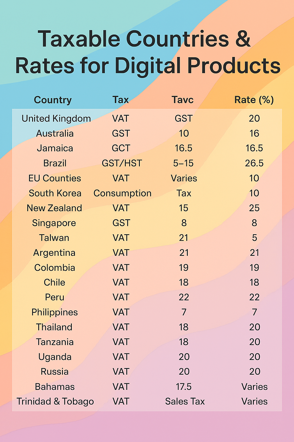 We collect taxes on digital goods for locations with digital-goods tax laws. Please refer to the “Taxable Countries & Rates” infographic for rates by country.