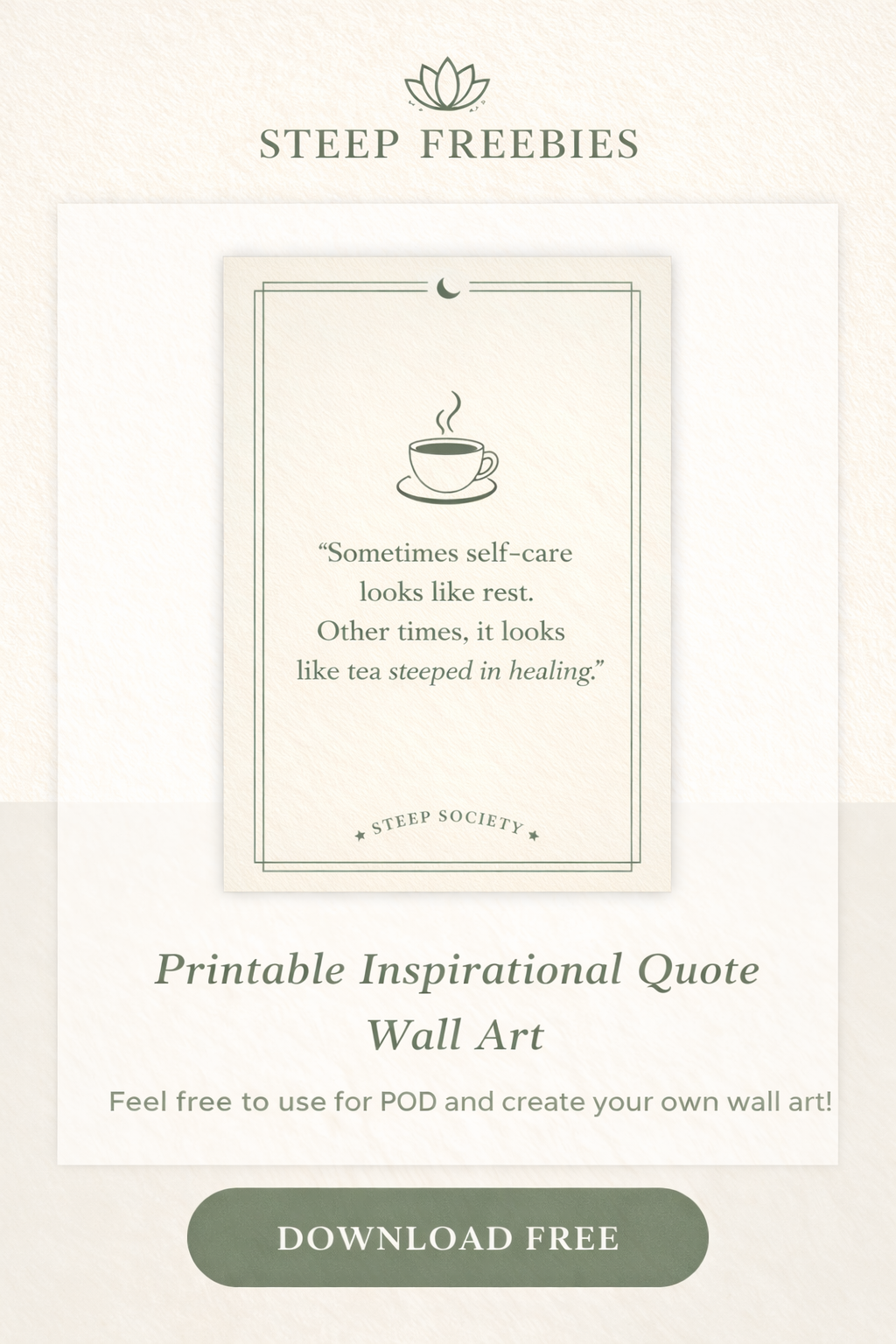Download this Steep Society inspirational quote as a free printable wall art design. Perfect for tea lovers, wellness spaces, and cozy reading nooks. Use it for personal décor or Print-On-Demand products to create your own calming art pieces rooted ...