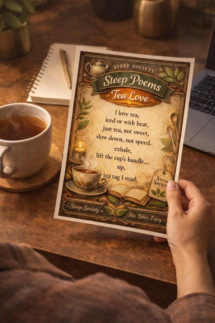 Poetry steeped in tea. Steep Poems features original poems inspired by specific teas and blends—crafted to evoke mood, aroma, and ritual. These pieces are perfect for printing as wall art, journaling, or pairing with your favorite cup for quiet reflection.
