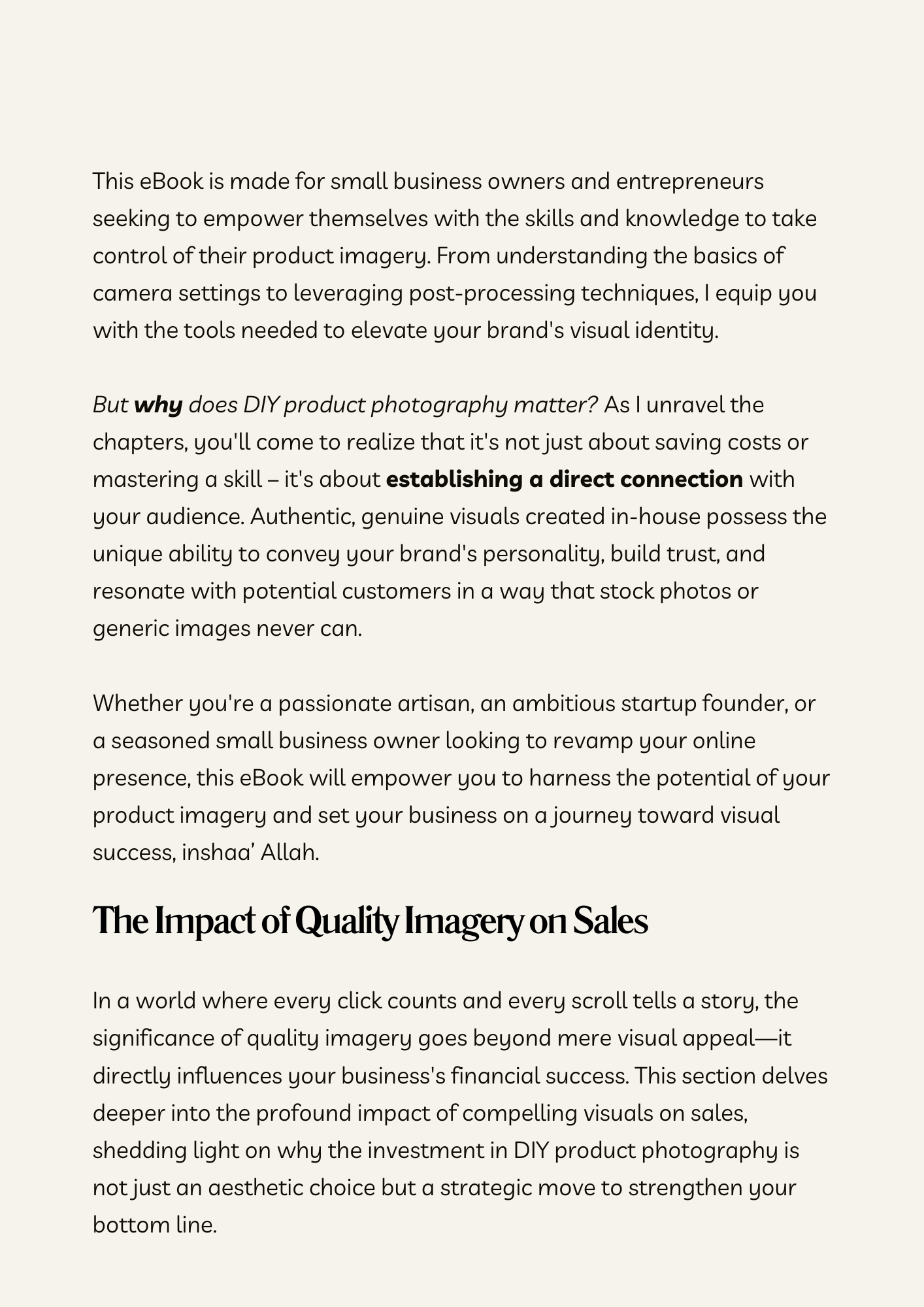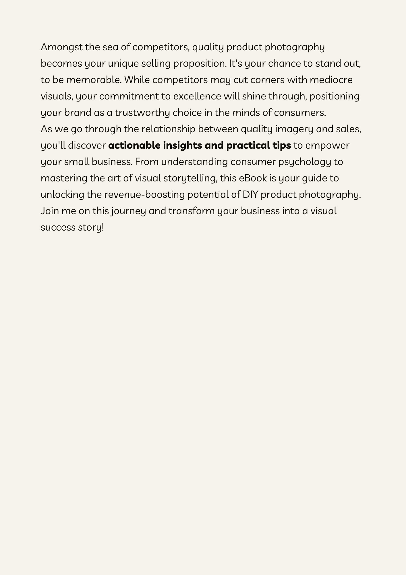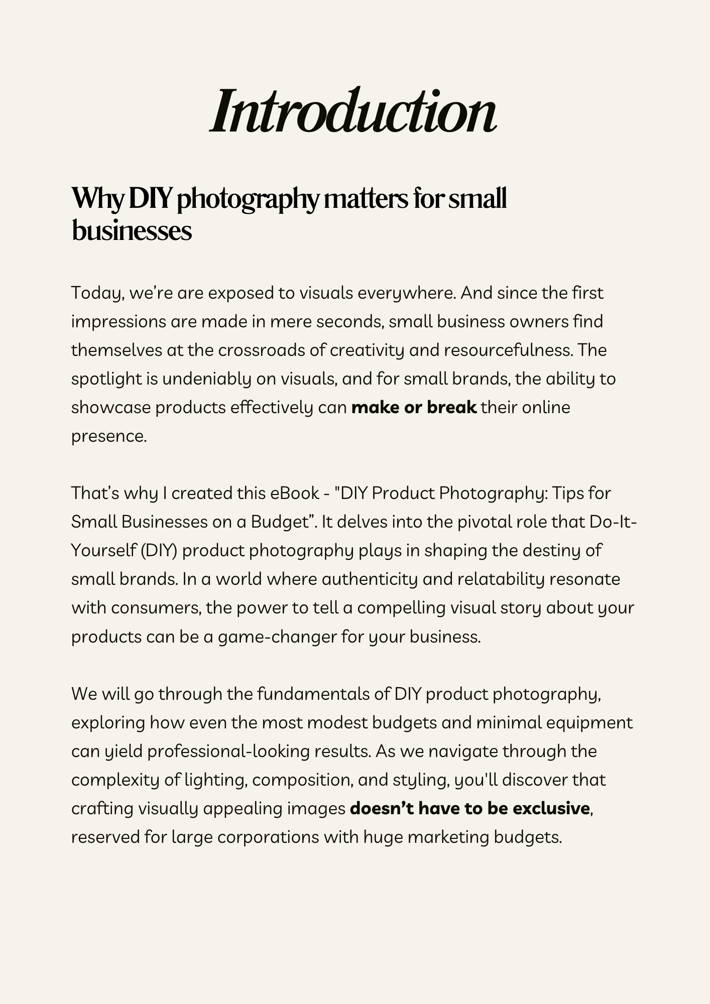 This E-book is for you as a product-based small business owner, a photographer that is just starting out or a UGC content creator. Anyone who works with creating content for product-based brands! Who wants to elevate your photography to next level.