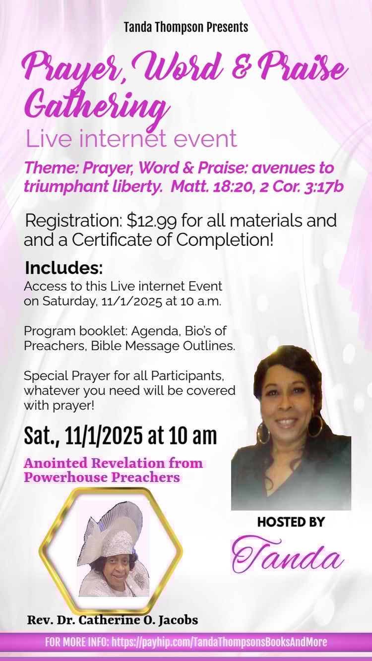 Our Prayer, Word & Praise Gathering Event is being postponed. We'll send out an Announcement on Facebook and our LinkedIn platforms when it is rescheduled in early 2026.