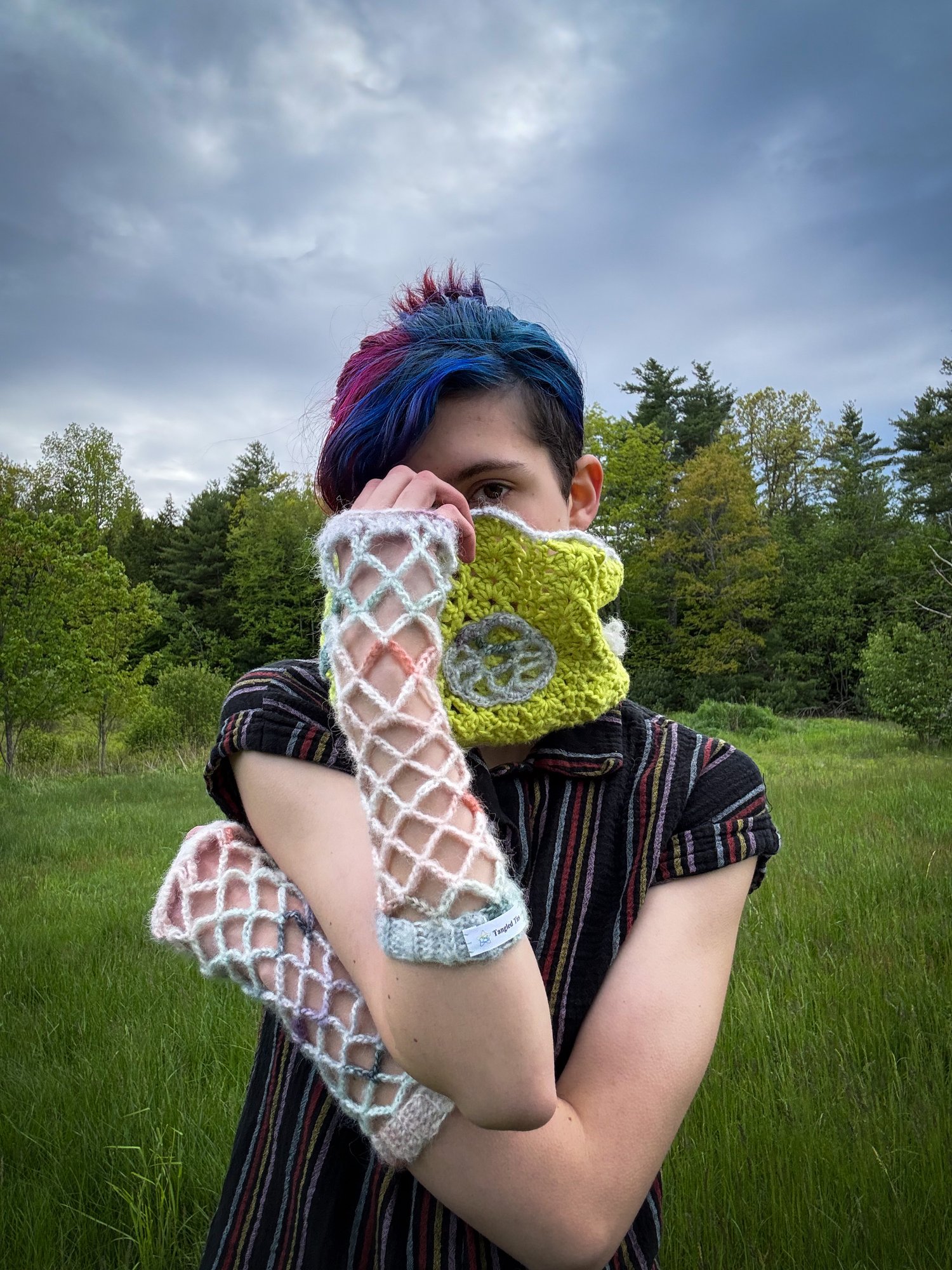 I am a queer artist (non-binary, panromantic), and I'm 18 years of age. I have dabbled in so many different methods of creation, but my current focuses are crochet, mixed media art, and character design. I am inspired by a lot of unexpected things, but if I had to pick my top categories it'd be animation (The Amazing Digital Circus, Arcane, Monster High), music (Origami Angel, and Blood Incantation are some of my faves), and the cycles of existence, taking old decaying concepts and infusing them with life. Which sounds quite dramatic, but really I'm just having fun exploring and experimenting with all the ideas swirling around in my brain.