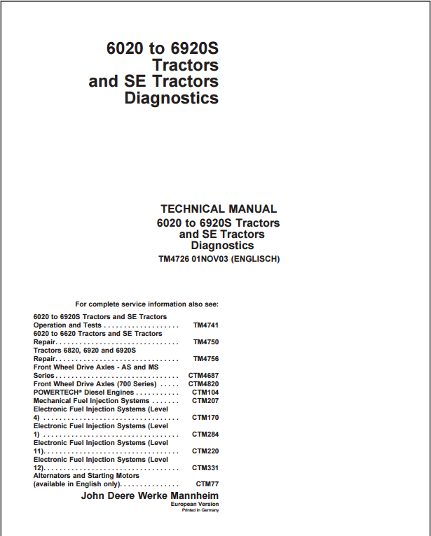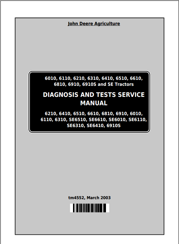 2003 John Deere 6010, 6110, 6210, 6310, 6410, 6510, 6810, 6910, 69105 And SE Tractors Diagnosis And Tests Service Manual Part No. TM4552
