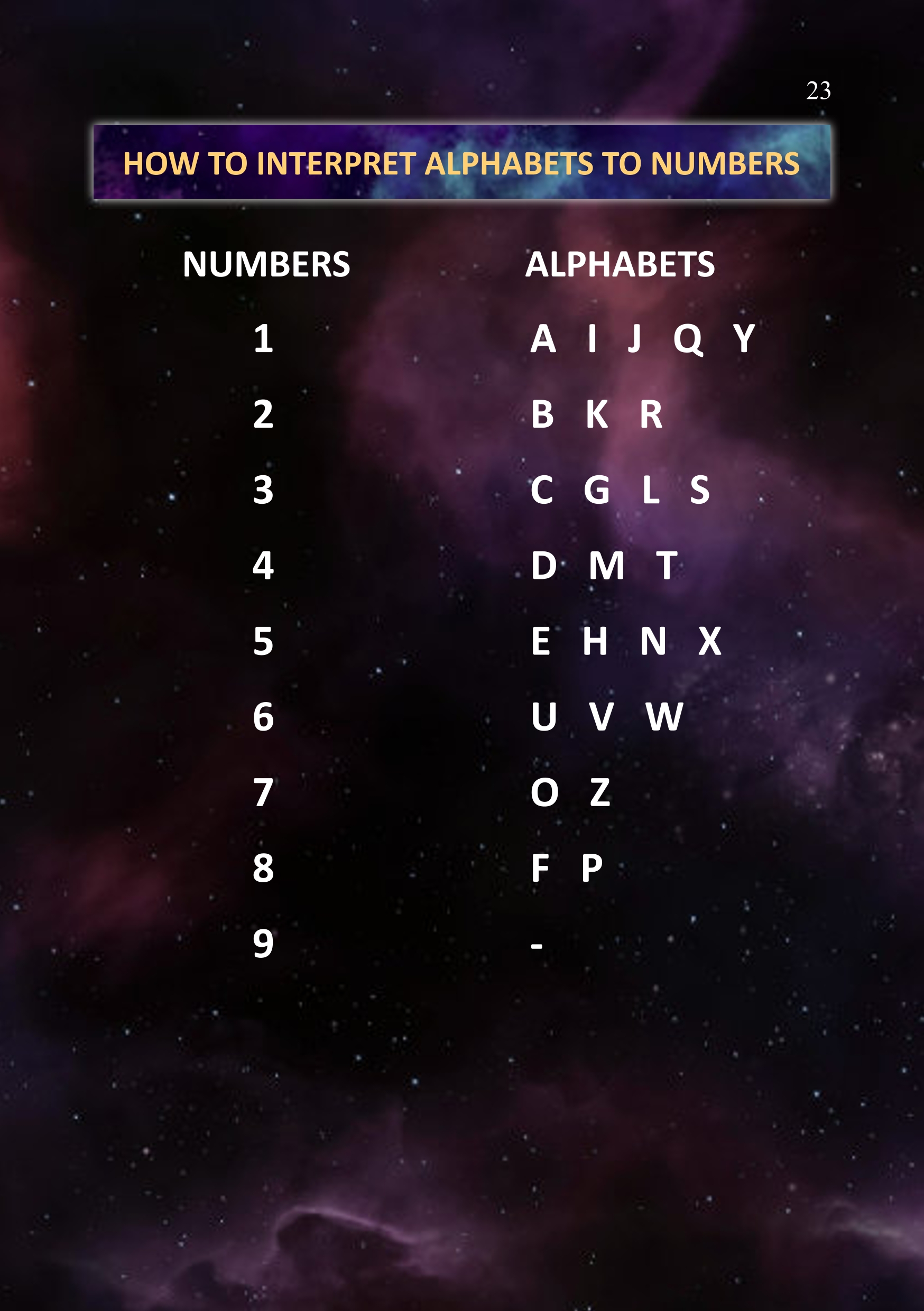 We are disseminating the essence of naming with Numerology and its scientific principles. They are unique. There are various versions of naming by Numerology in use today. All have their peculiar views on the interpretation of planets, how the planets relate to numbers, and the conversion of numbers to alphabets, thus the accuracy may vary.