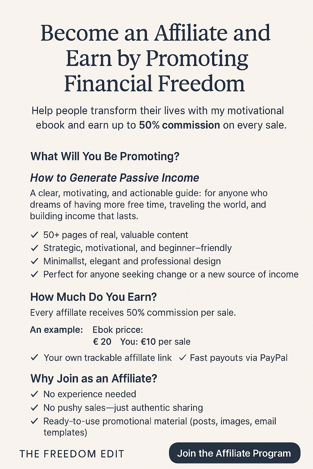 Become an Affiliate and Earn by Promoting Financial Freedom Help people transform their lives with my motivational ebook and earn up to 50% commission on every sale. No costs, only gains. Freedom for you—and for your audience. 💡 What Will You Be Pro...