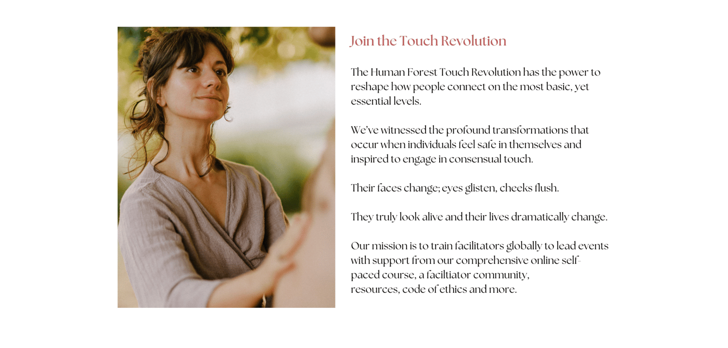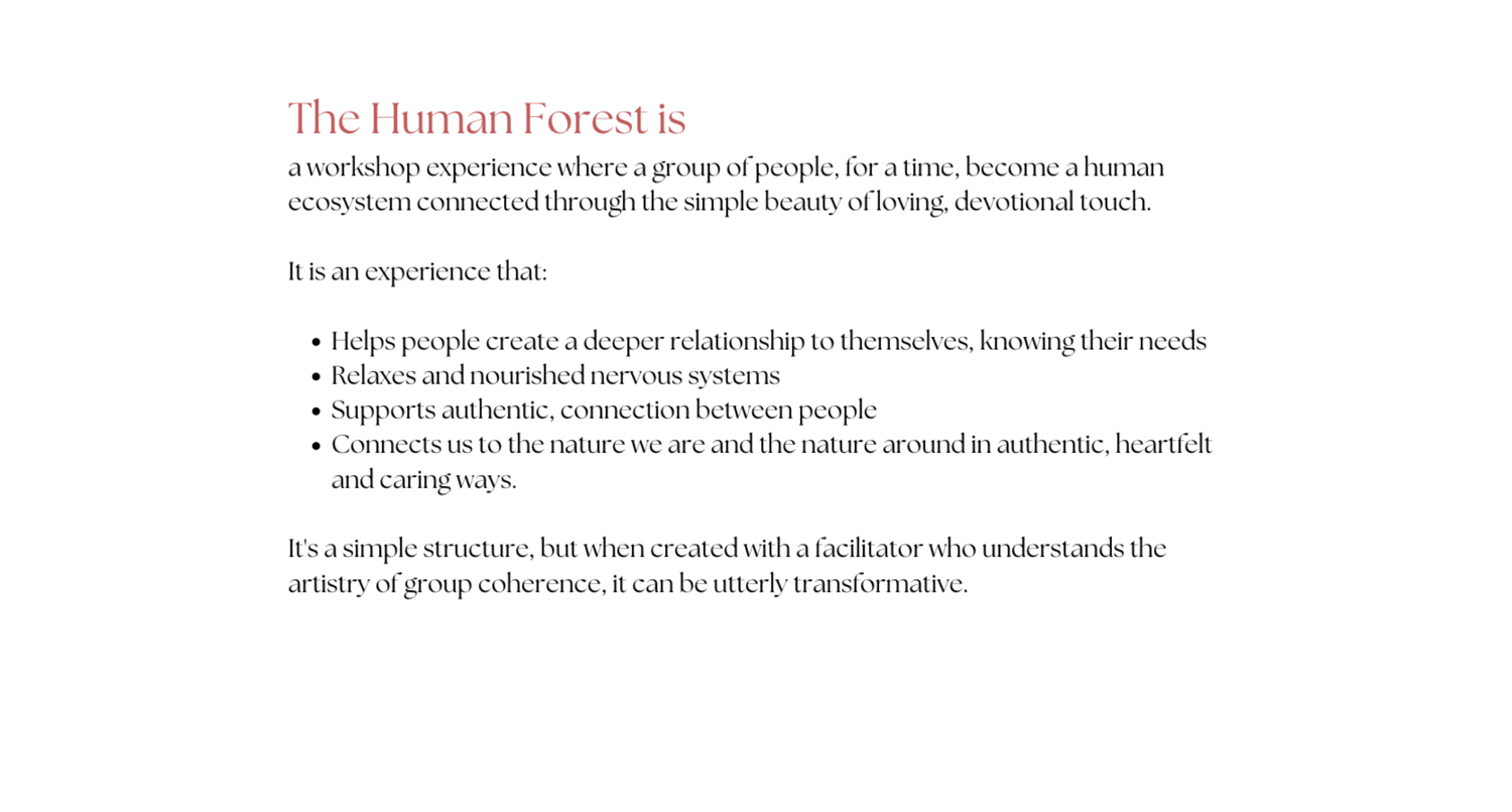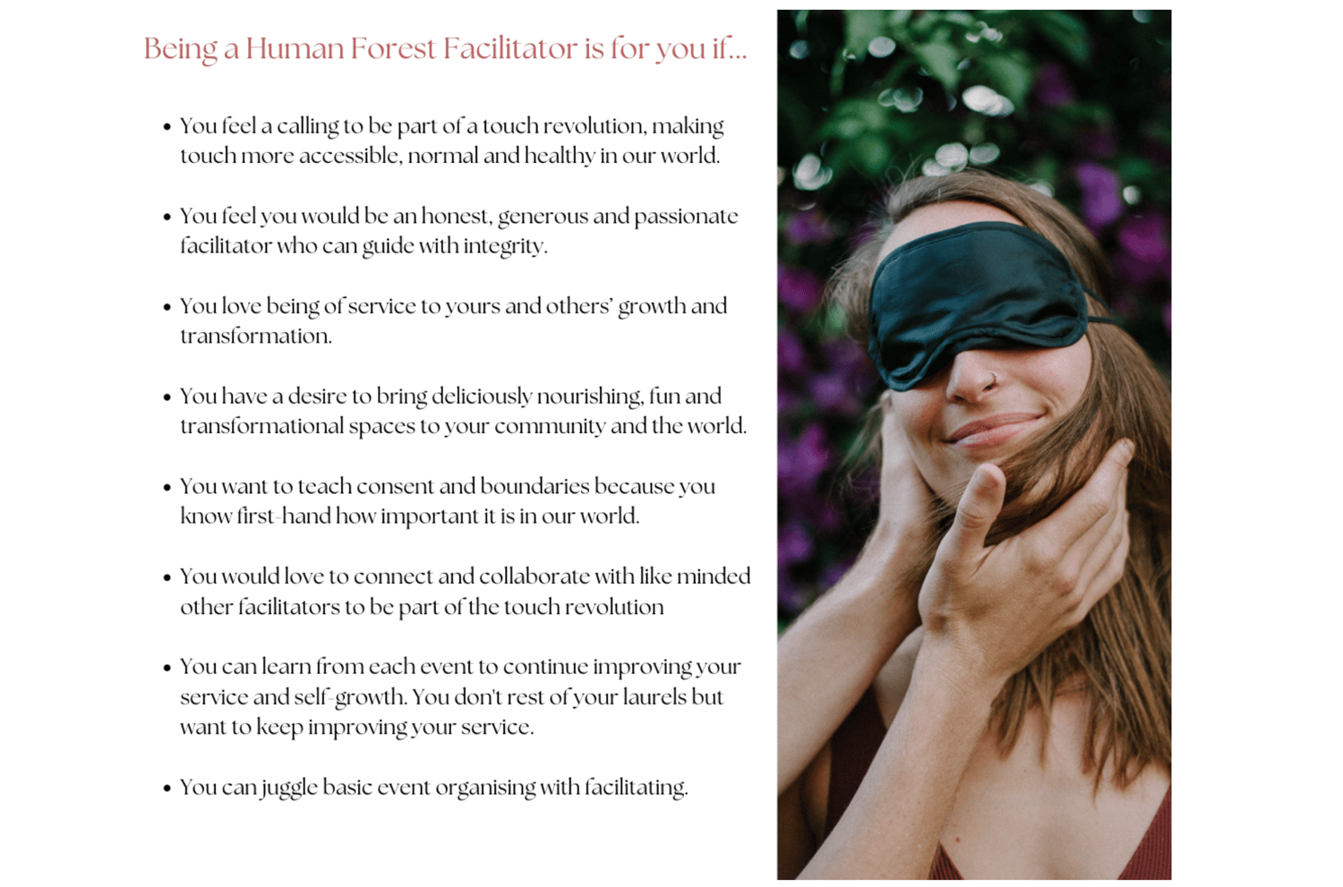 We first started running Human Forests in Melbourne post covid lockdowns when people were hungry for touch, connection and community. We then took our Human Forests on tour up the east coast of Australia, to England, Portugal, Greece, France, Germany before creating this online course to help support budding facilitators.