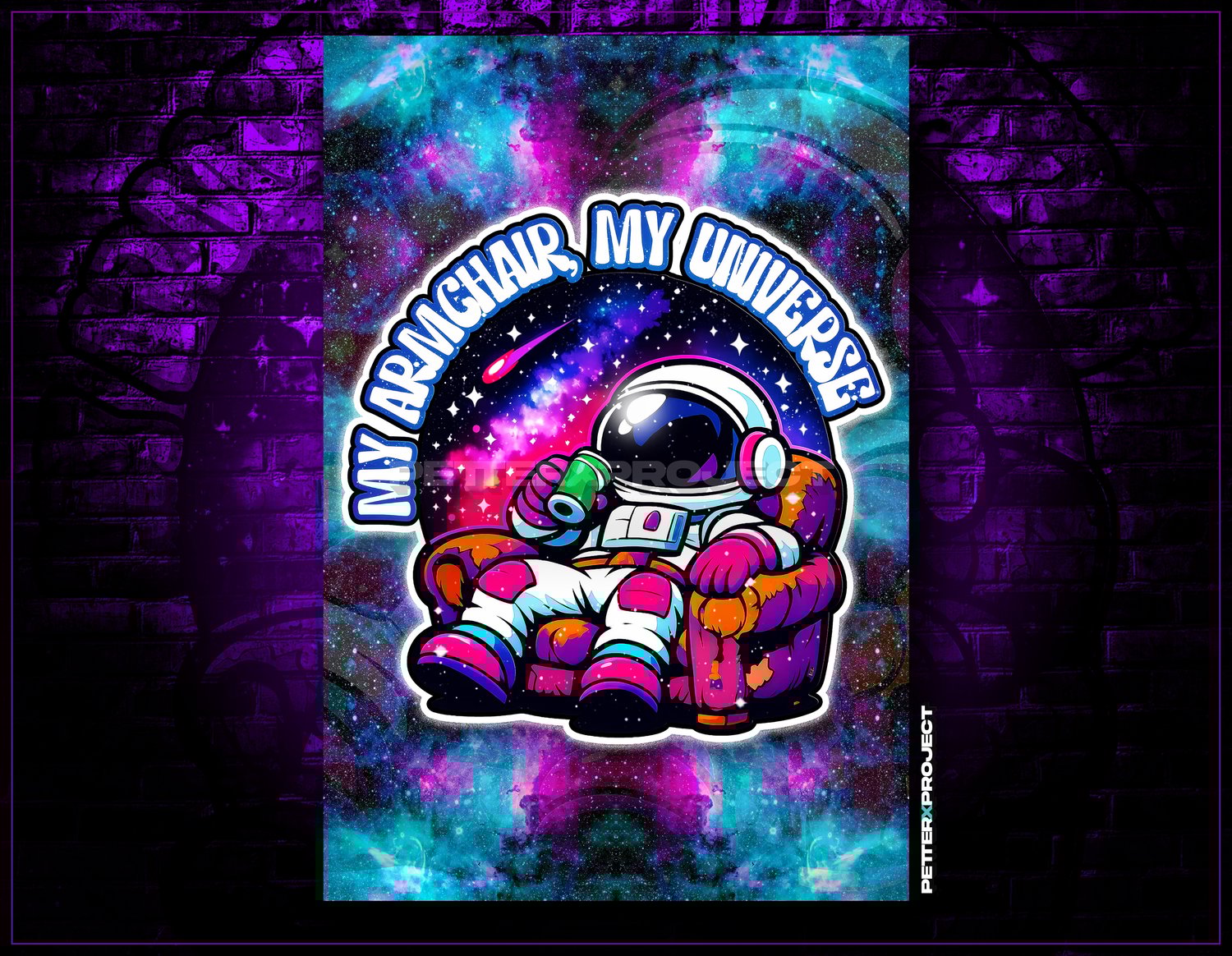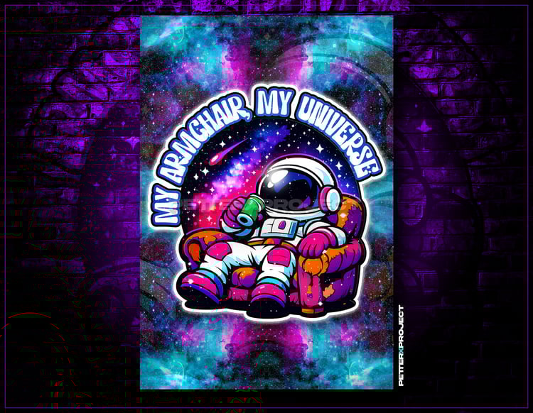 ✦ Digital Art: "My Armchair, My Universe" 🚀 This vibrant vector art features a chill astronaut kicking back in a worn-out armchair, sipping a drink while drifting through a psychedelic galaxy. It’s the ultimate mix of homey comfort and deep space exploration, packed with bold lines and trippy colors. Perfect for anyone looking for that unique, laid-back cosmic vibe on stickers, posters, or streetwear.