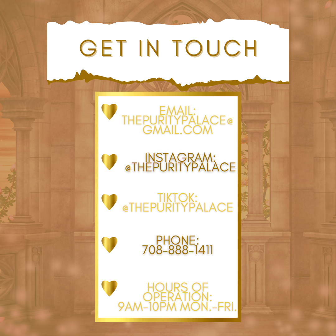 Get familiar with The Purity Palace's policies before placing your order! Review the shipping and refund policies below. Reach out if you have any questions and remember, follow The Purity Palace on social media!