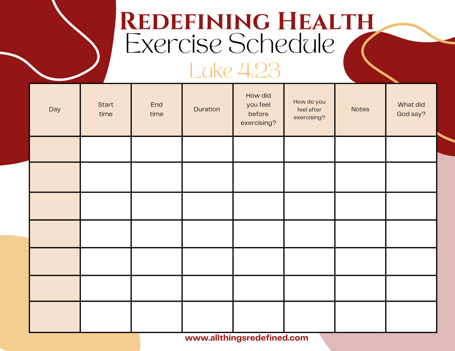 Take control of your health and spiritual wellness with this simple, yet powerful Exercise Tracking Sheet. Designed for women seeking holistic transformation, this free resource helps you track your daily exercise, monitor emotional and physical responses, and reflect on what God is saying throughout your journey.