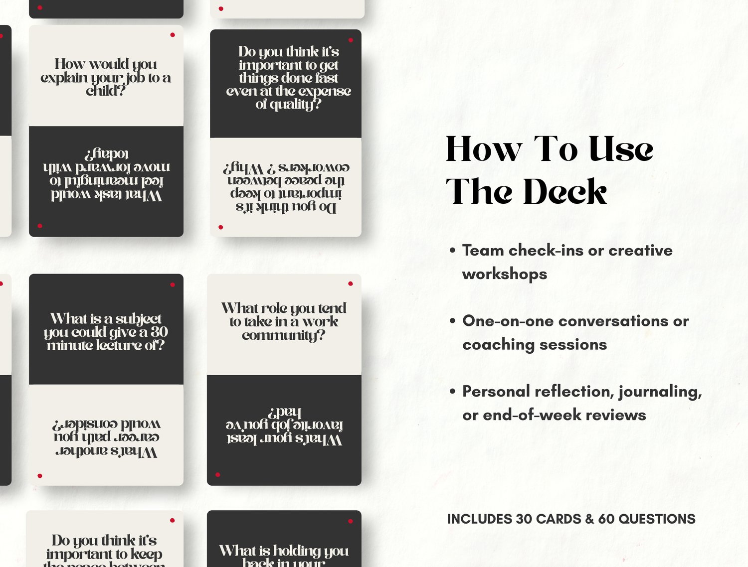 Use them as conversation starters before meetings, during coffee breaks, or when getting to know new co-workers. When used on your own, the questions help you explore what truly matters to you at work and how you see yourself as a professional.